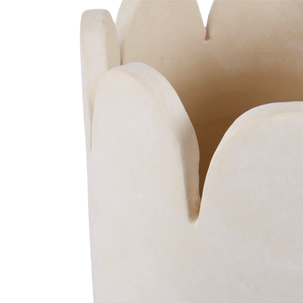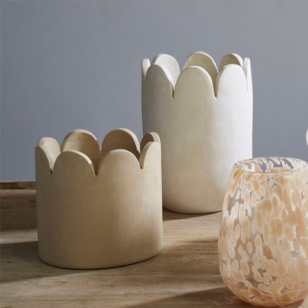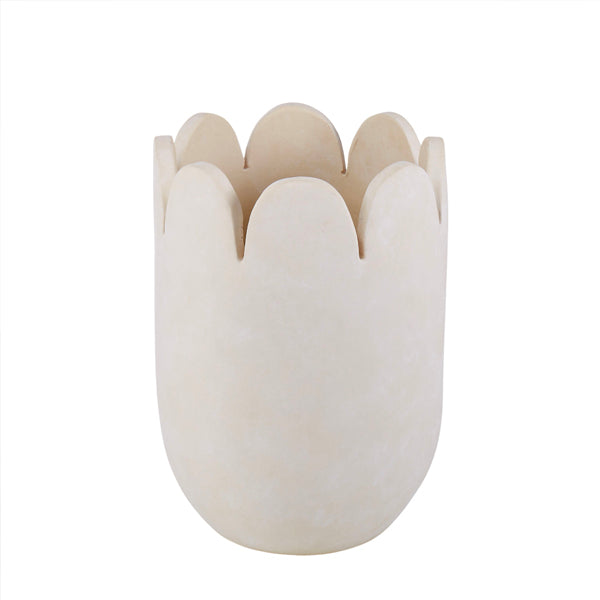 The Ceramic Stonewashed Scallop Pot in Washed White features a rounded base and scalloped edge, resembling a flower bud.