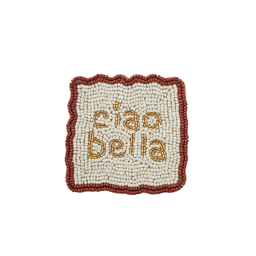 For the chic entertainers, this beaded coaster features a gentle wavy burgundy edge, with the words "ciao bella" in champagne gold on a background of cream.