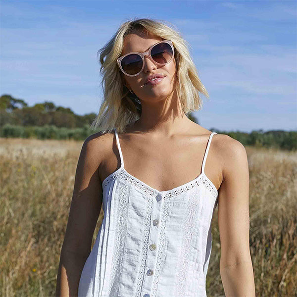 CLOVER in Milky Peach is fitted with gradient brown lenses which prove to be a beautiful combination for most skin tones and face shapes.