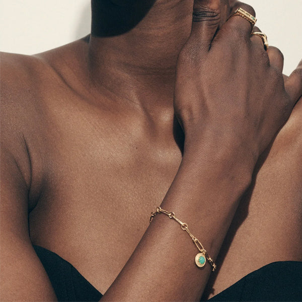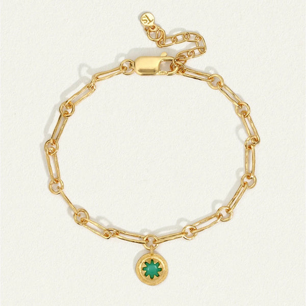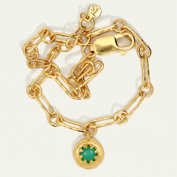 The Cora Bracelet, in 18k gold vermeil, features a softly brushed coin charm falling from a handmade chain. The round pendant features an Australian chrysoprase gemstone set with a radiant sun design, inspired by ancient Turkish, Bedouin and Berber jewellery.