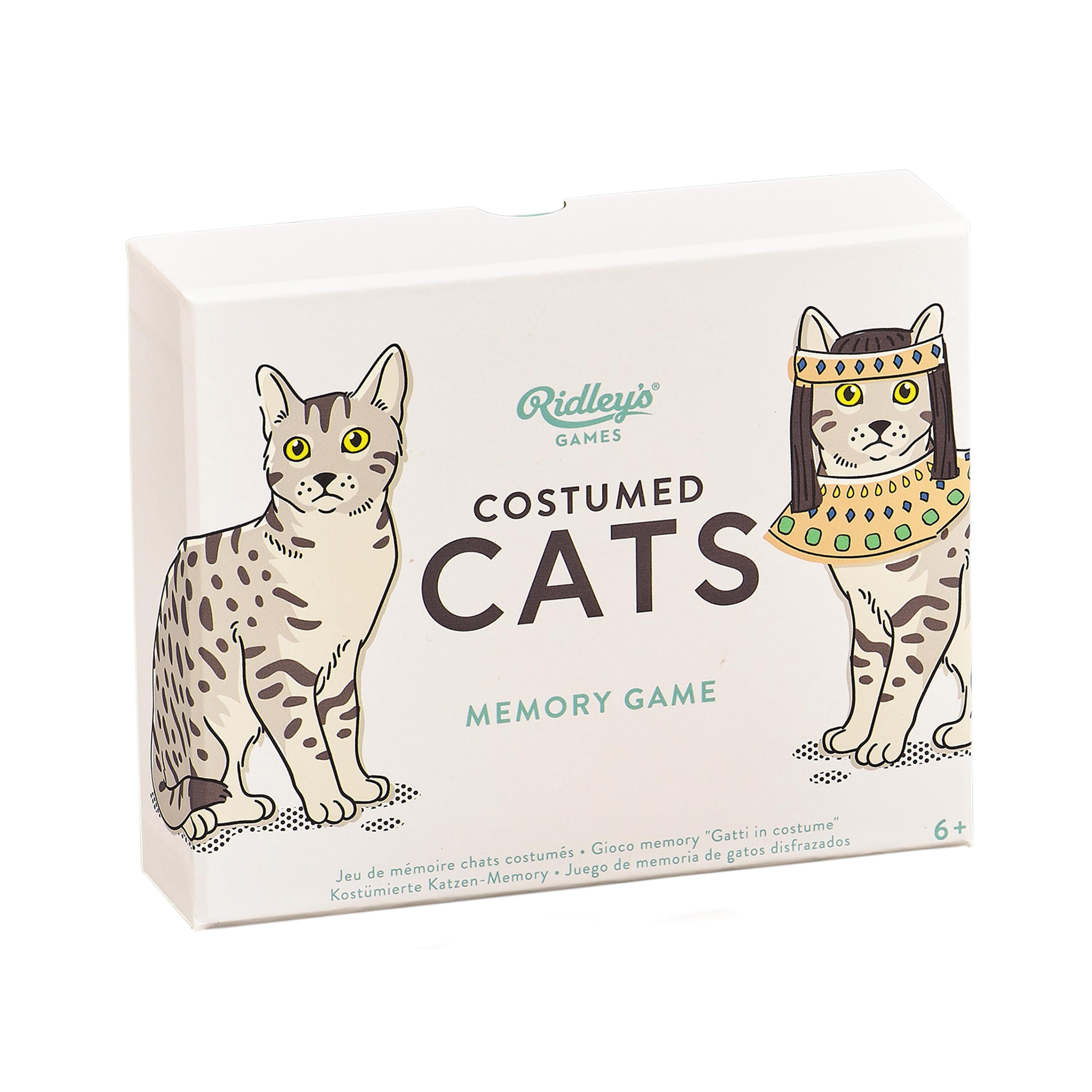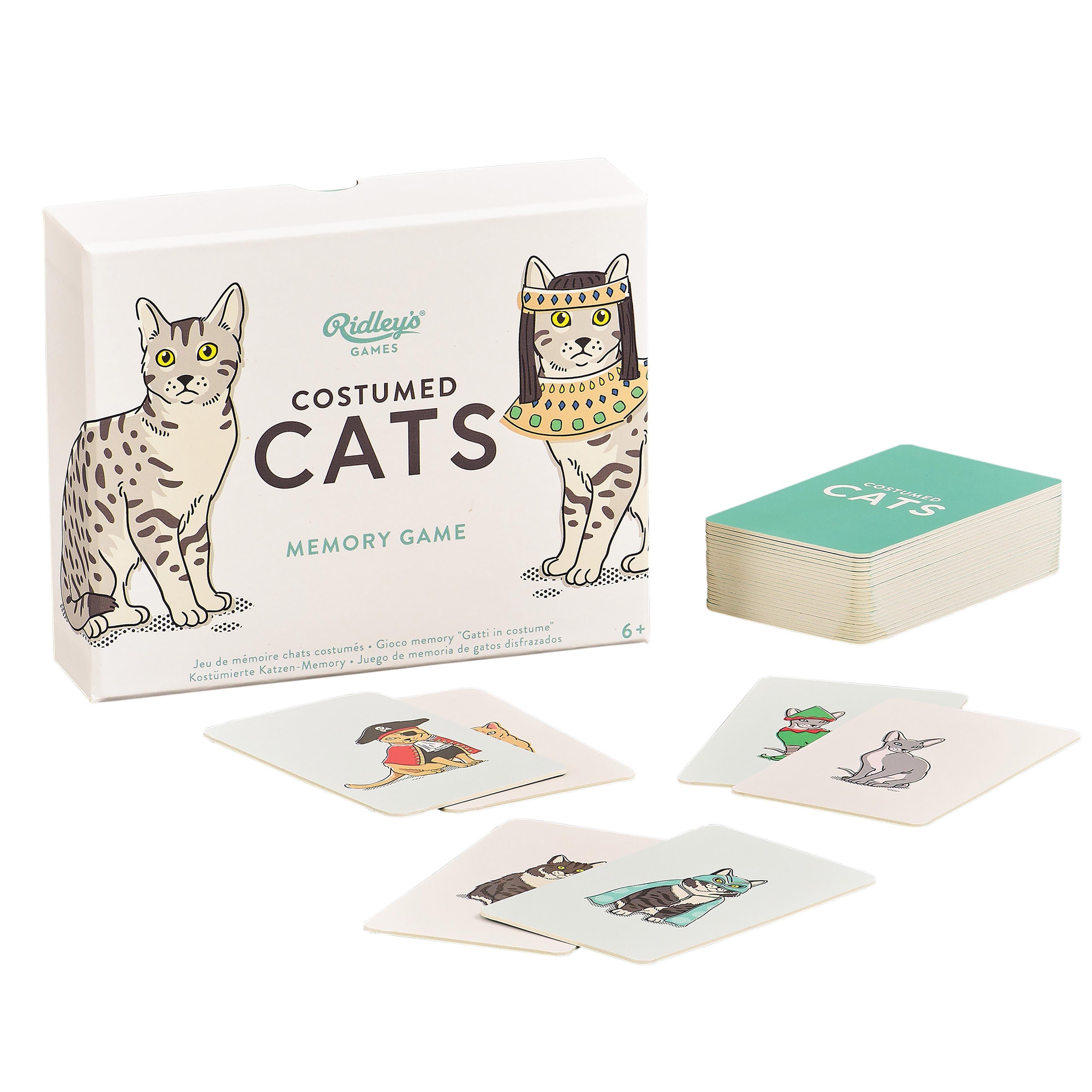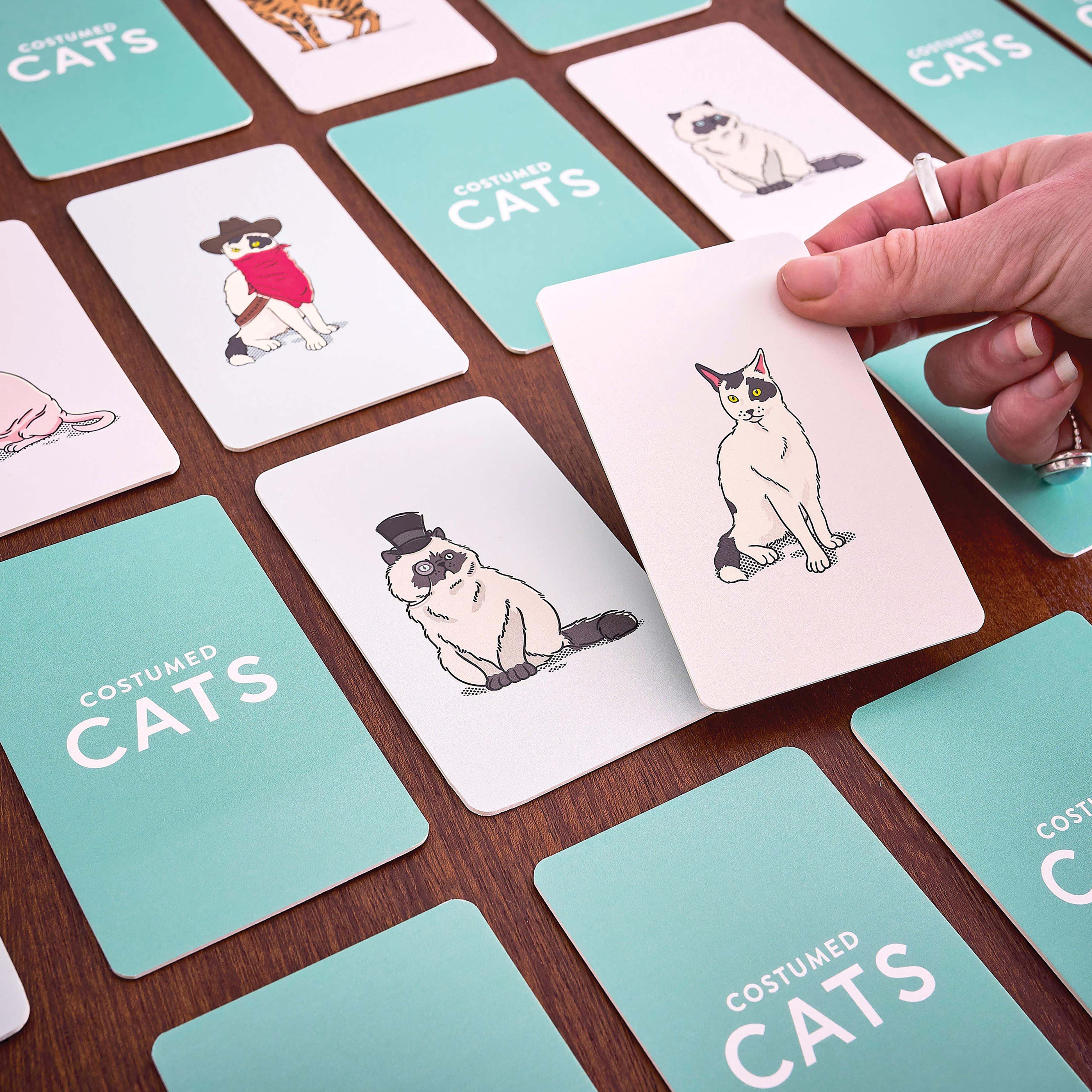 Take it in turns to pick two cards to reveal and try to match the cats to their fetching costumed companions.