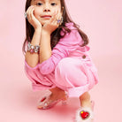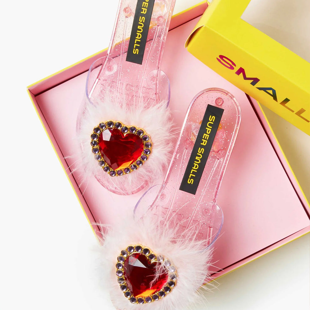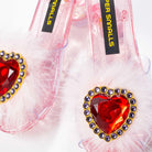 - Glittery pink play heels feature oversized red heart jewel and feather accents