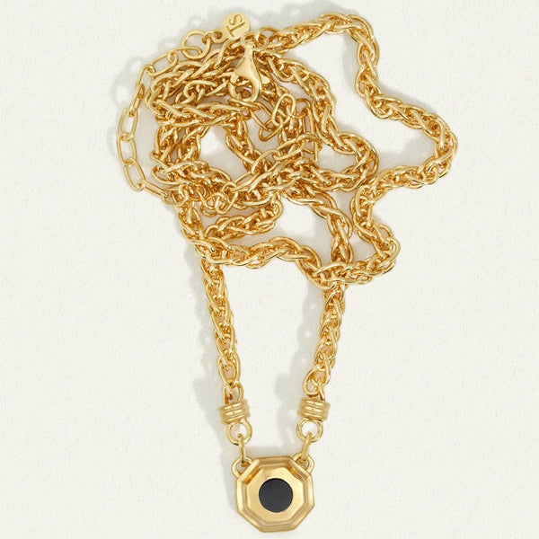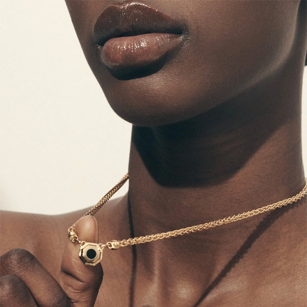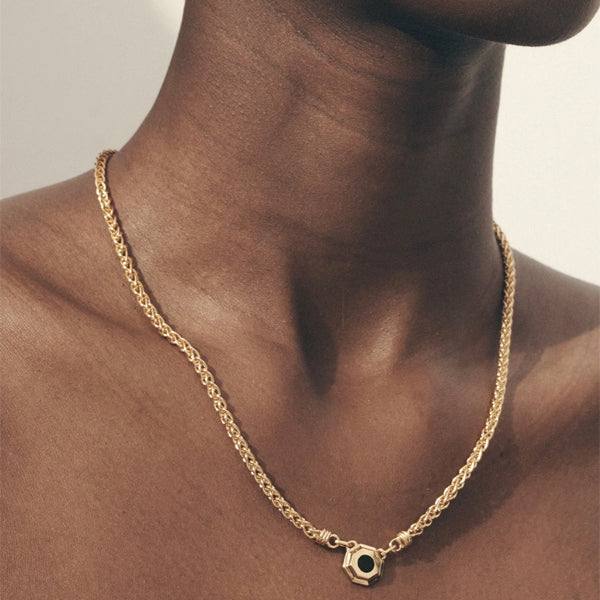 A simple polished pendant reflects the light emanating outwards from a heart of black onyx. Like the serenity of winter or the calm of night, it creates a nurturing space for rest and renewal before a magnificent resurgence. The sumptuously braided wheat chain emerging from this pendant represents the abundance and richness of its namesake.