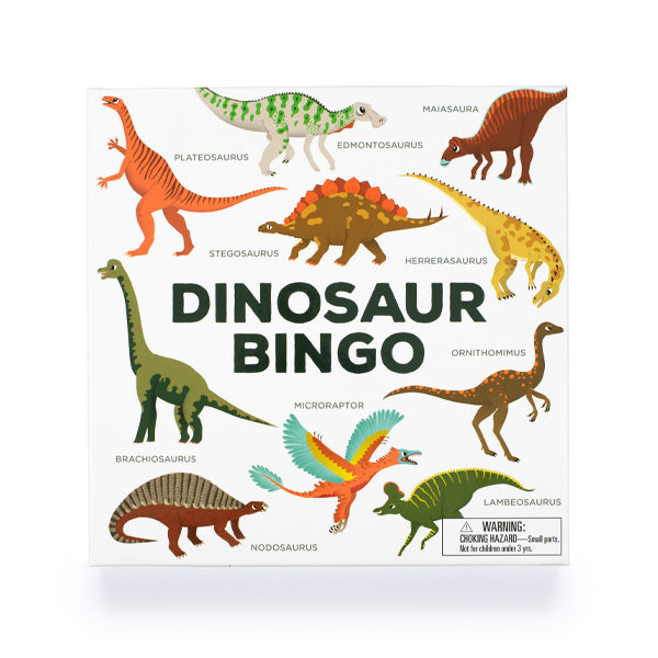 Dinosaur Bingo contains 48 chips and a cardboard dino head to store them in, a game board, eight double-sided bingo cards and Jurassic counters for you to mark up your card.