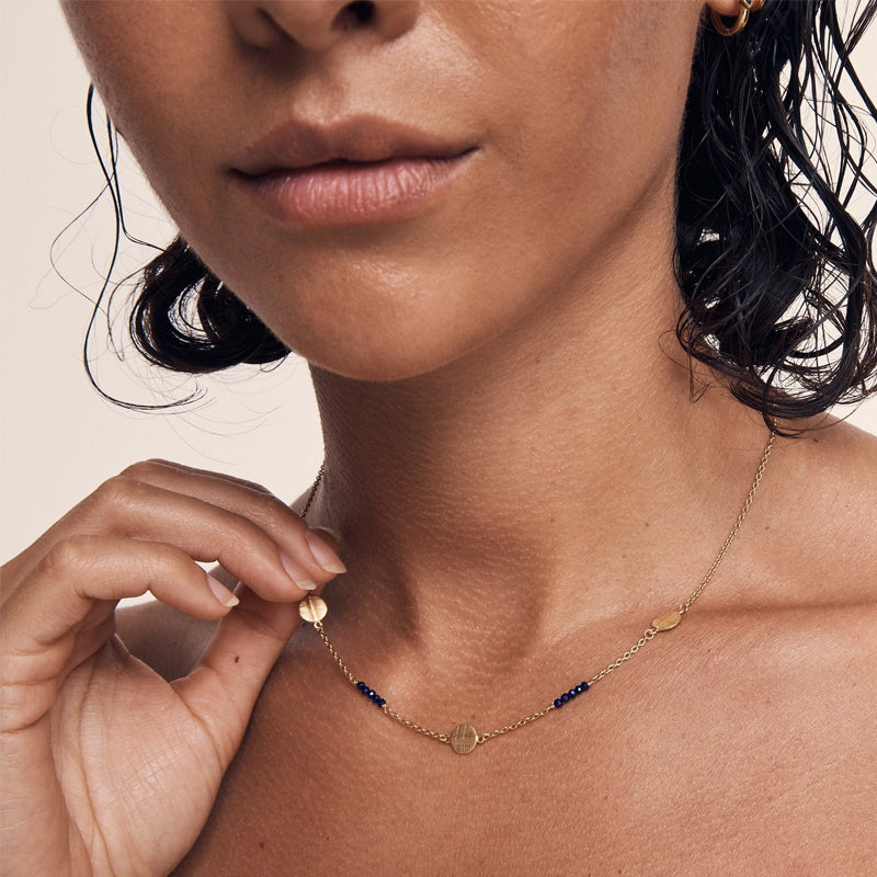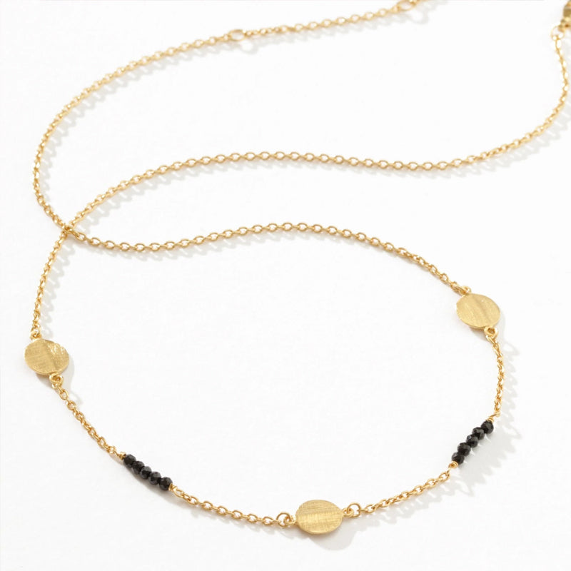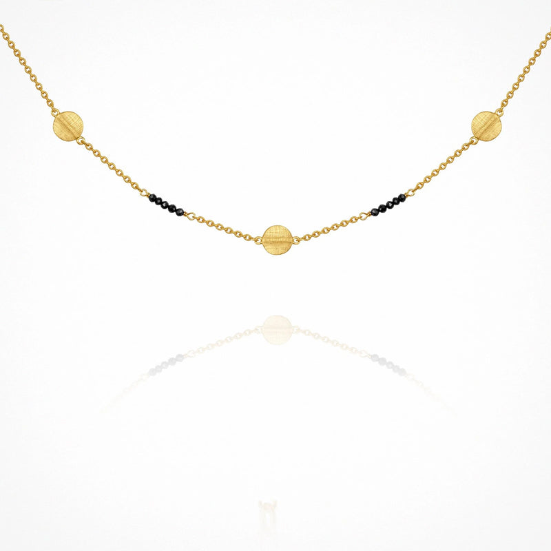 The Elio Necklace in 18K Gold Vermeil is a fine, glittering cable chain with faceted Black Spinel beads and three cross brushed sun disc details representing the sun's journey across the sky. Black Spinel speaks to empowerment, protection and is known for its grounding properties. The chain and beading of the Elio Necklace reflect the light, reminding us that there is always sunlight at the end of the darkest nights.