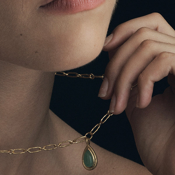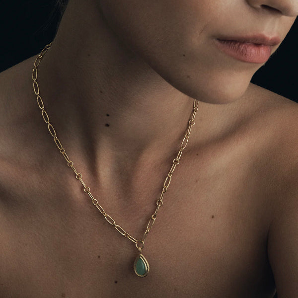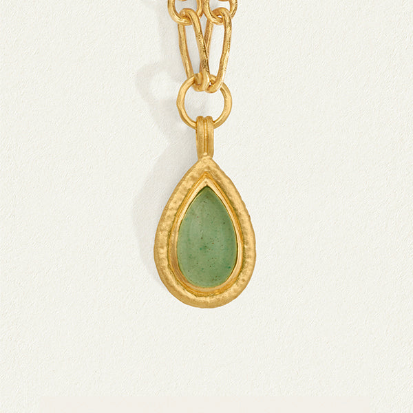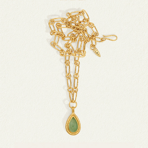 Inspired by nature, the 18k gold vermeil Elodie Necklace features a pear-shaped pendant set with a green aventurine cabochon, on a handmade link chain.