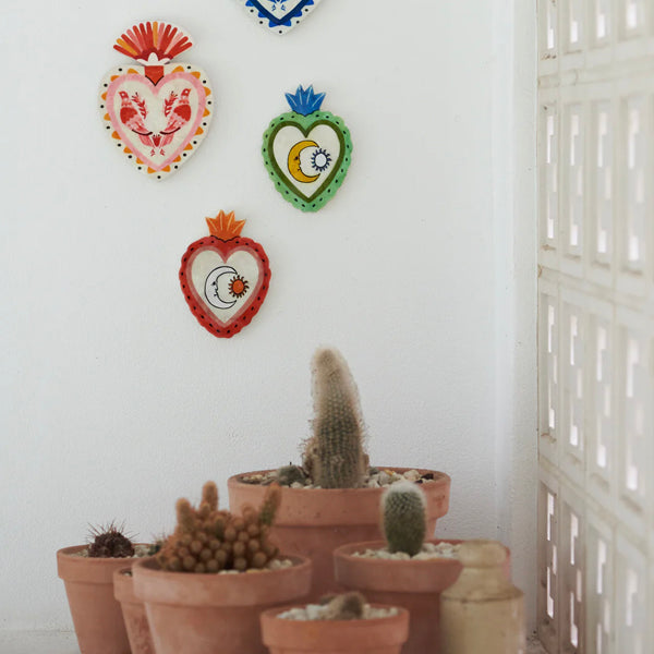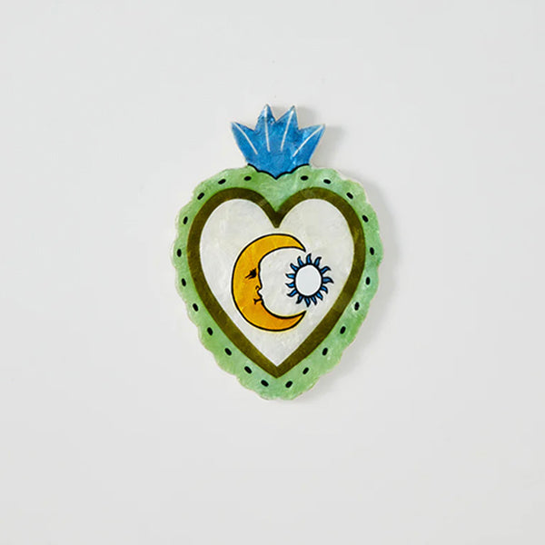 Introducing the Fuego Moon Green Wall Tile, a captivating small capiz art piece shaped like a heart, featuring a burst of lively fire at the top reminiscent of Mexican-style decor. At its centre, a hand-painted moon and star motif add an enchanting touch of celestial beauty.