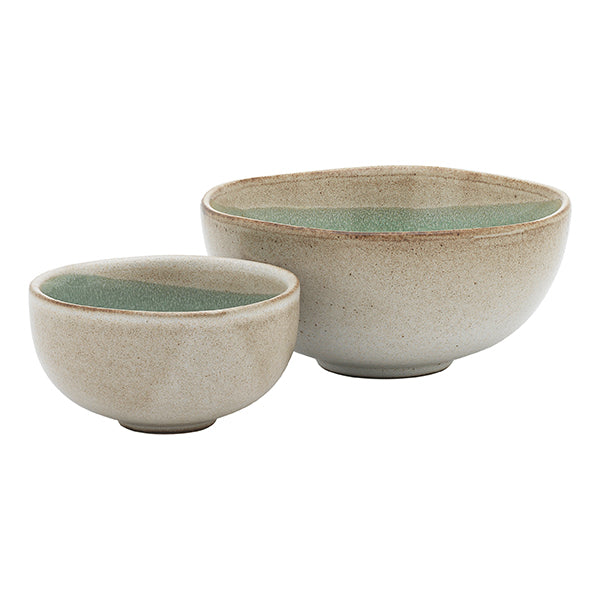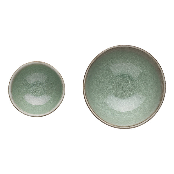 The organic pebble-like design of this Set of 2 Dip Bowls is hand-painted in a restful sage hue, finished with an all-encompassing cinnamon speckle in a reactive gloss glaze.