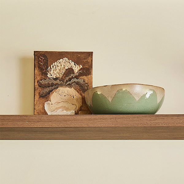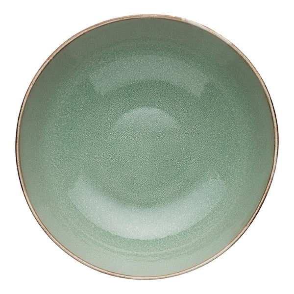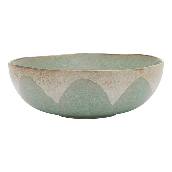 The organic pebble-like design of this Serving Bowl is hand-painted in a restful sage hue featuring a scallop design, finished with an all-encompassing cinnamon speckle in a reactive gloss glaze.