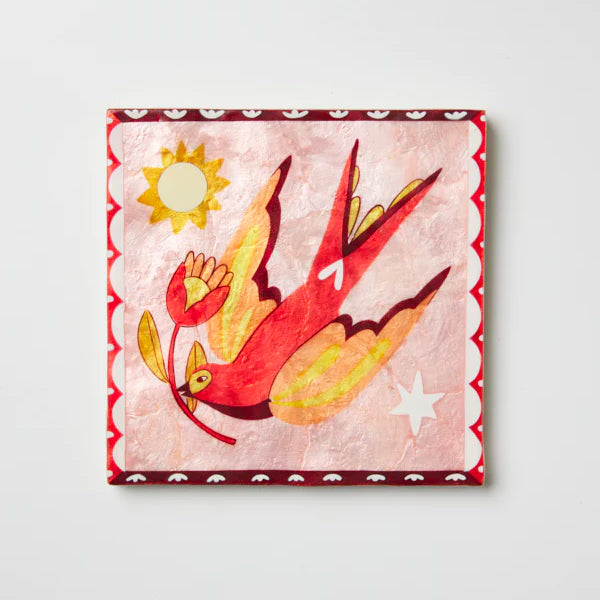 Bring the beauty of nature to your home with the Gardienne Bird Wall Art Tile in Pink, designed like a stamp and featuring a retro style swallow illustration.