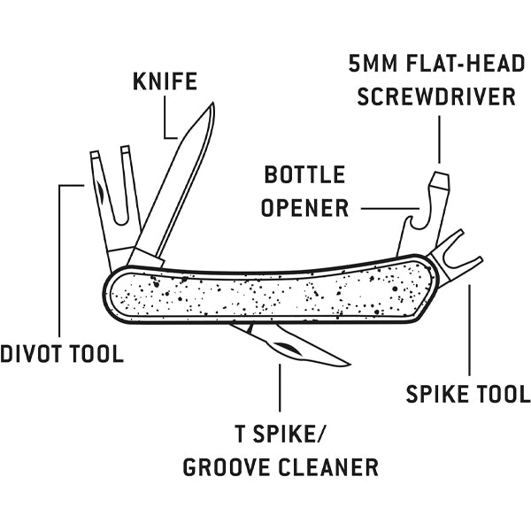 Includes 6 titanium finish tools including a divot tool, T-spike and groove cleaner, spike tool, screwdriver and bottle opener in speckled paint design.