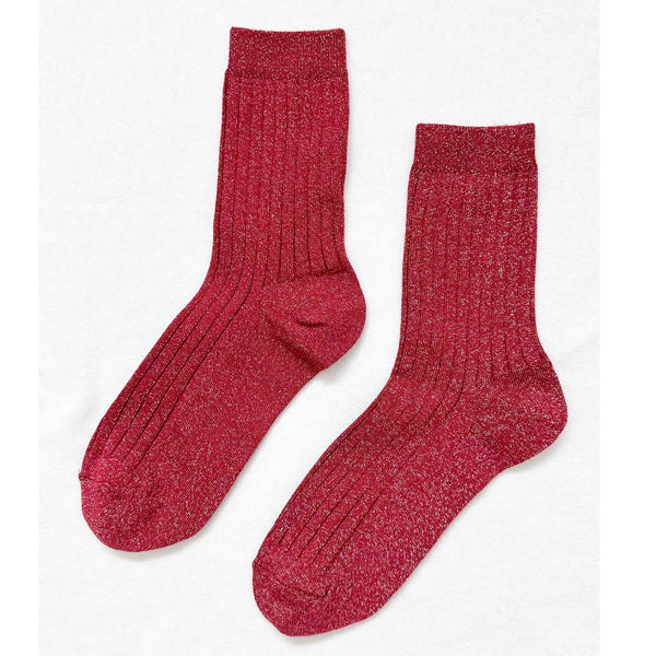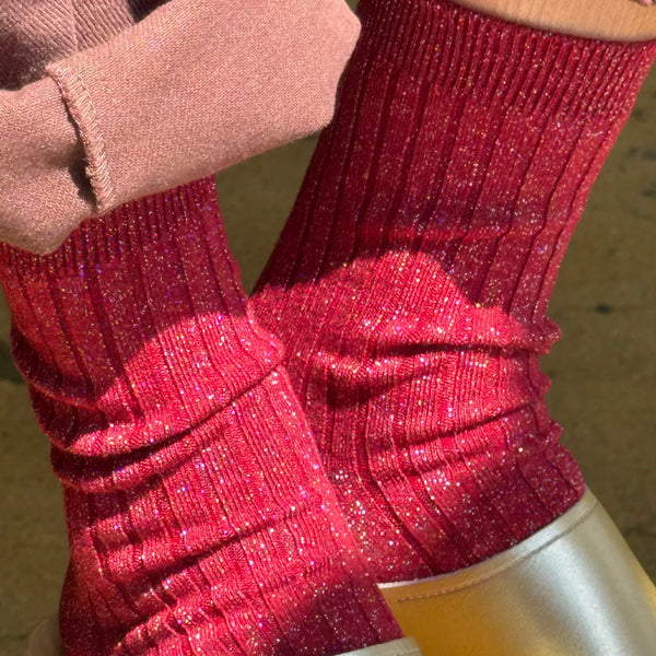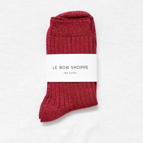 A little sparkle goes a long way. When you're feeling a little extra, this glittery version of Le Bon Shoppe's OG Her Socks is your go-to gal. She adds a festive element to any outfit! Now in a super soft and supple modal blend yarn, these are the perfect height ribbed socks with just the right amount of sparkle. On those special occasions we love to dress her with a silky dress and strappy heels, or an elegant jumpsuit and pop color pump!