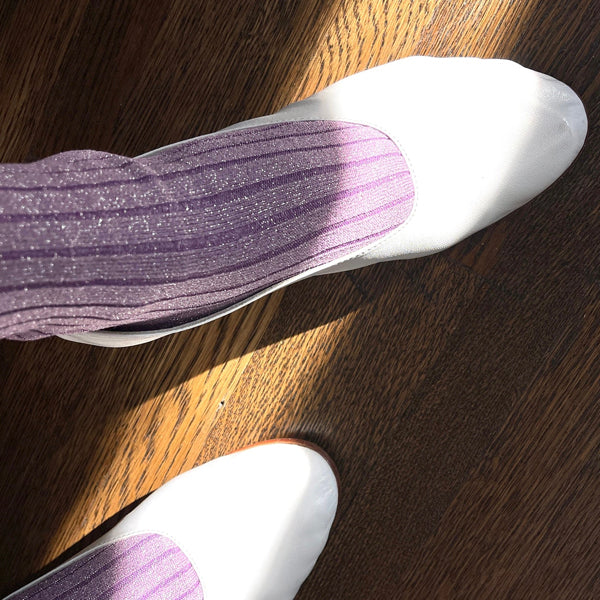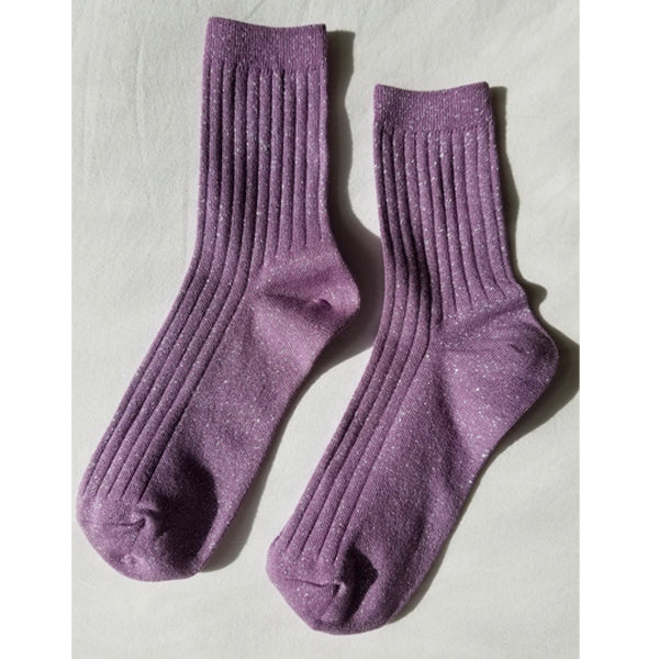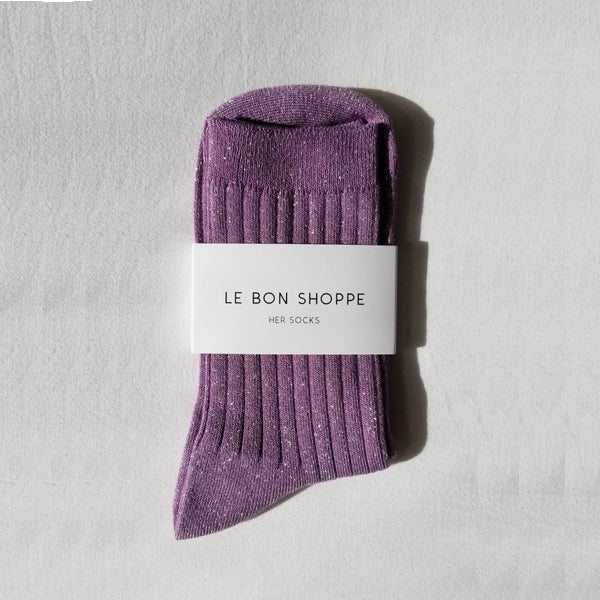 A little sparkle goes a long way. When you're feeling a little extra, this glittery version of Le Bon Shoppe's OG Her Socks is your go-to gal. She adds a festive element to any outfit! Now in a super soft and supple modal blend yarn, these are the perfect height ribbed socks with just the right amount of sparkle. On those special occasions we love to dress her with a silky dress and strappy heels, or an elegant jumpsuit and pop color pump!