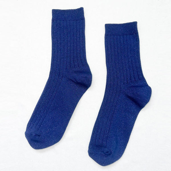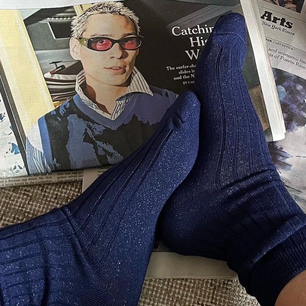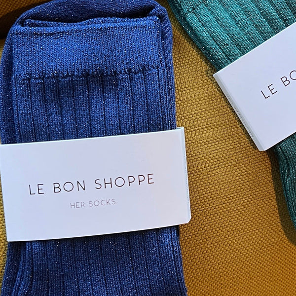 A little sparkle goes a long way. When you're feeling a little extra, this glittery version of Le Bon Shoppe's OG Her Socks is your go-to gal. She adds a festive element to any outfit! Now in a super soft and supple modal blend yarn, these are the perfect height ribbed socks with just the right amount of sparkle. On those special occasions we love to dress her with a silky dress and strappy heels, or an elegant jumpsuit and pop color pump!
