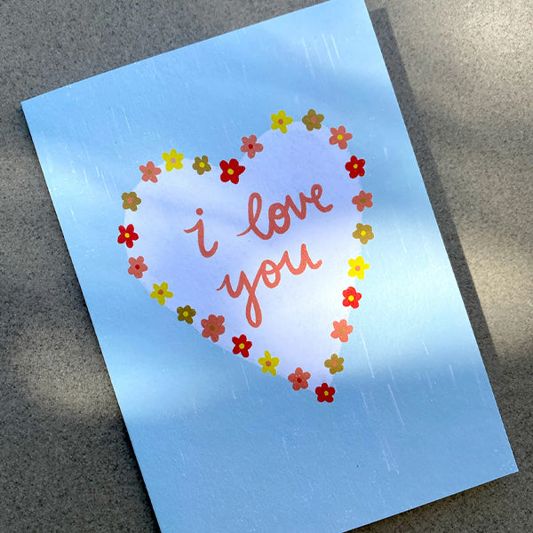 Let someone know just how much you love them with this illustrated greeting card. Many of our cards, like this one, live beyond being shared as a card, and look beautiful as a framed keepsake. This design is a heart with an outline of tiny flowers and "I Love You" handwritten within, on a bright blue background. Blank inside for a personal message