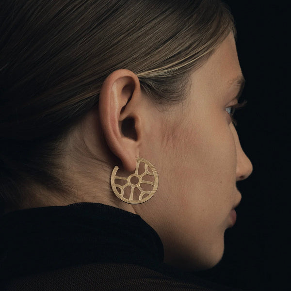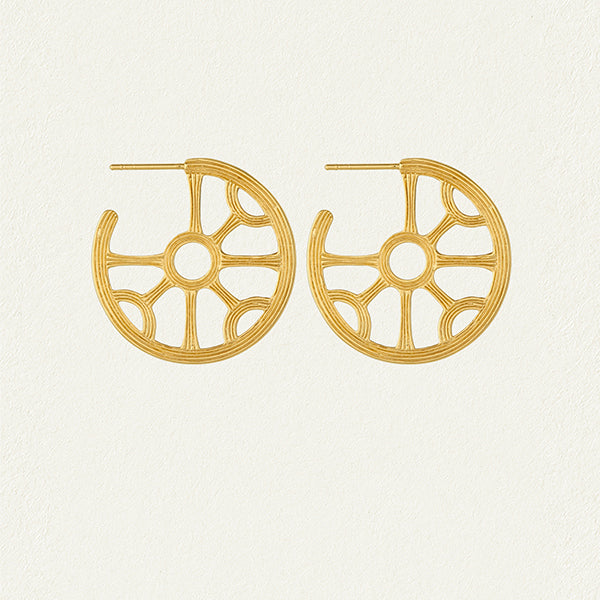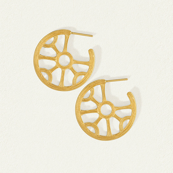 Crafted from 18k gold vermeil, these openwork Kalinda Hoop Earrings feature radiating spokes converging at a central ring. This design draws inspiration from ancient cultures, referencing solar motifs found in Greco-Roman art.