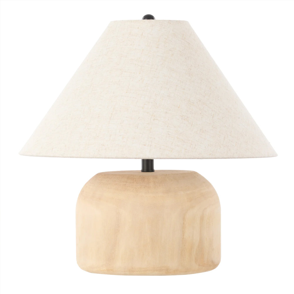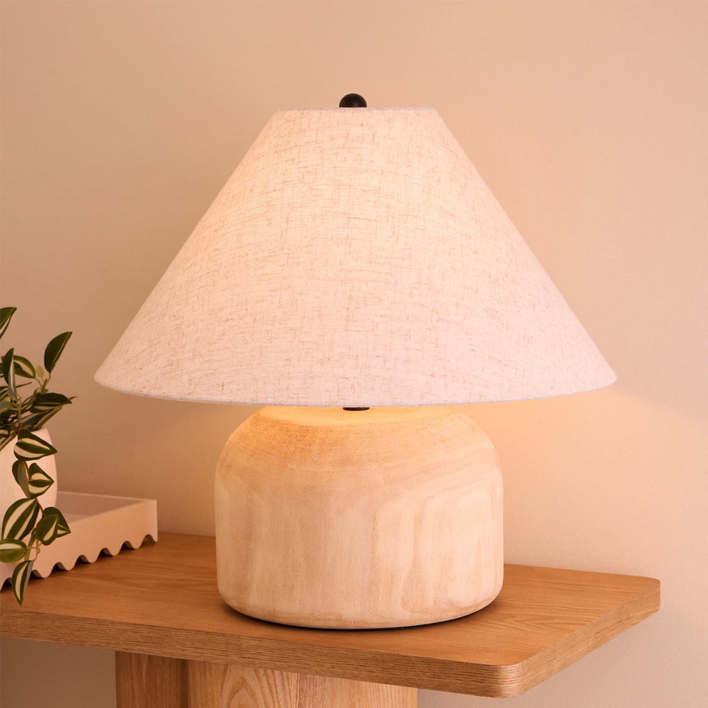 The Lorah Table Lamp features a rounded rubber wood base and linen shade - its softness beautifully contrasted by a black post and cord. Its generous size and elegant contemporary design make a stylish and practical statement in any home.
