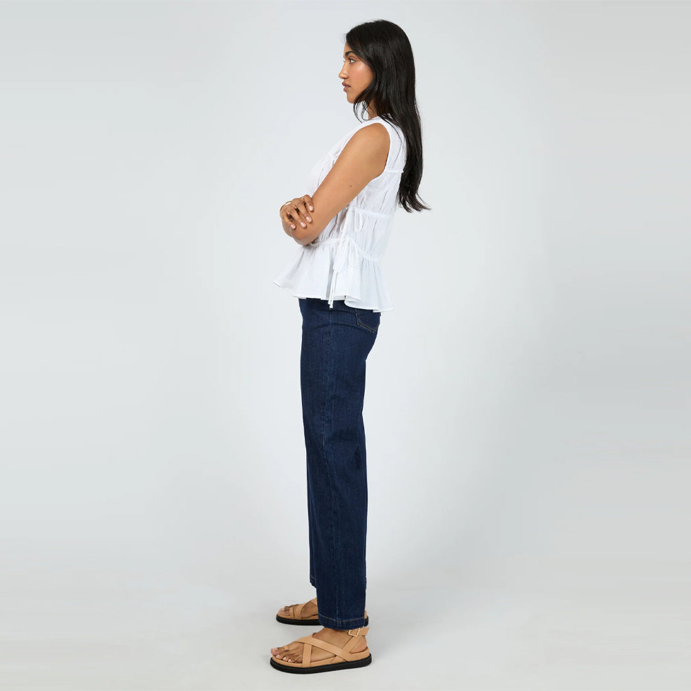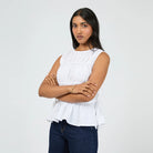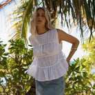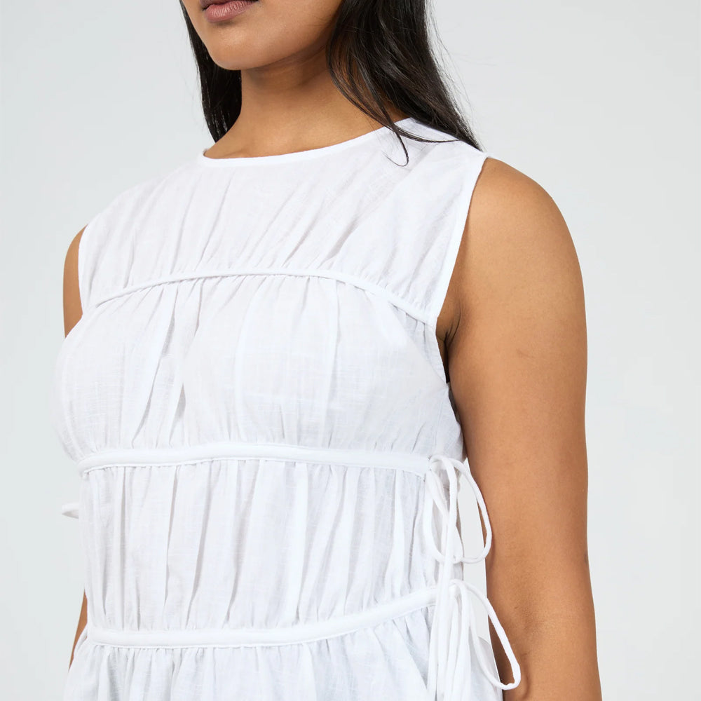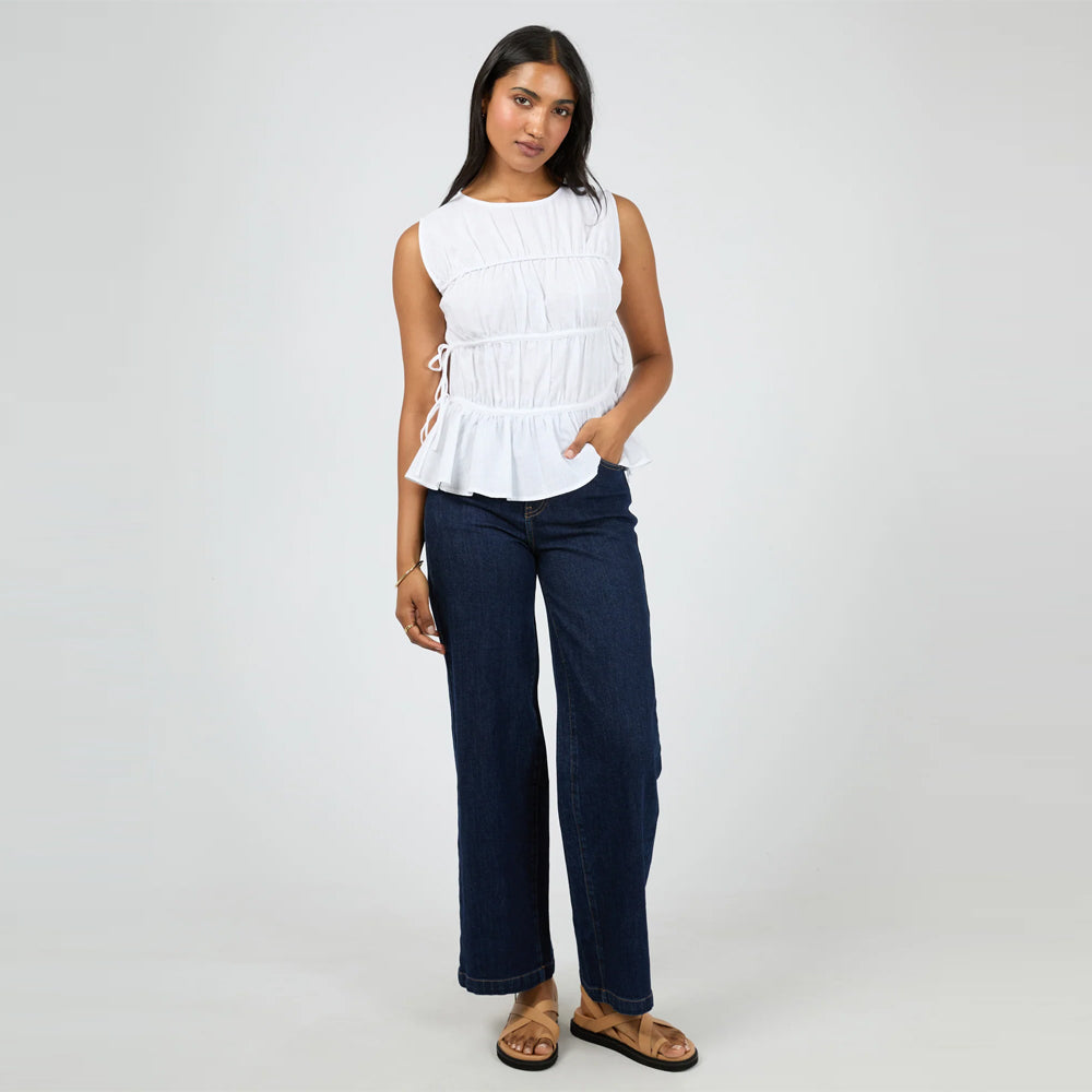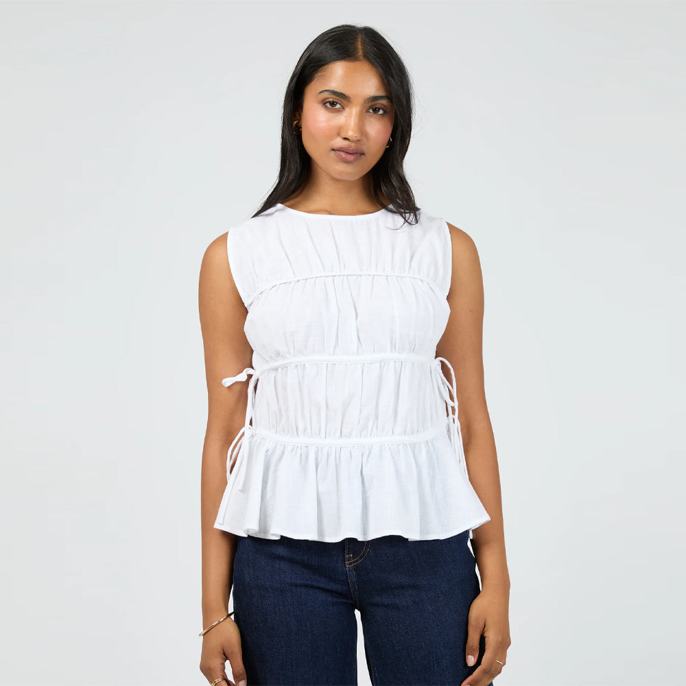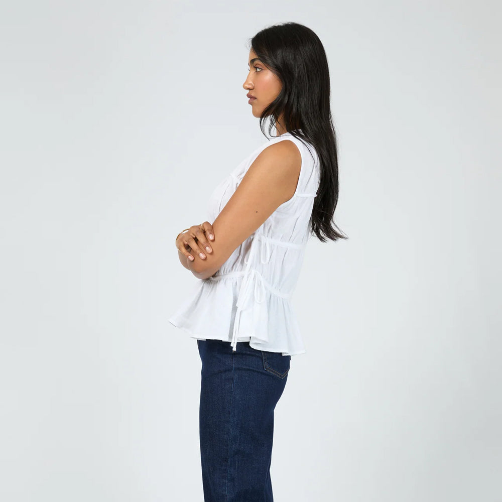 The Lou Lou Tie Top (All About Eve Clothing) in white features a stylish tie closure and ruched fabric that flatters your silhouette. Its adjustable tie design ensures a comfortable, personalized fit, while the ruched detailing adds texture and charm. Perfect for layering or wearing on its own, this top combines comfort with a chic, versatile look.