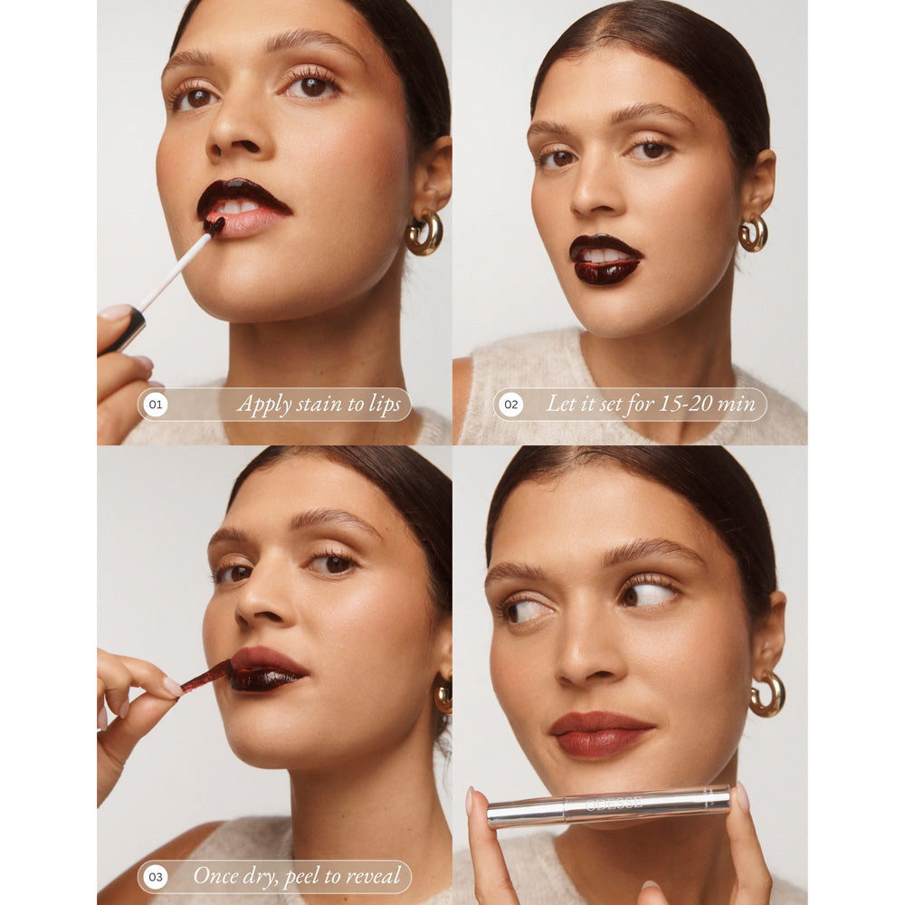 To use, simply start with clean, product-free lips. Apply the stain to lip line or entire lips. Let it set for 15-20mins, or til fully dry. Once dry, peel off the film to reveal the stain. Done! Wear as is, or finish with your favourite balm or gloss to hydrate and enhance the stain.