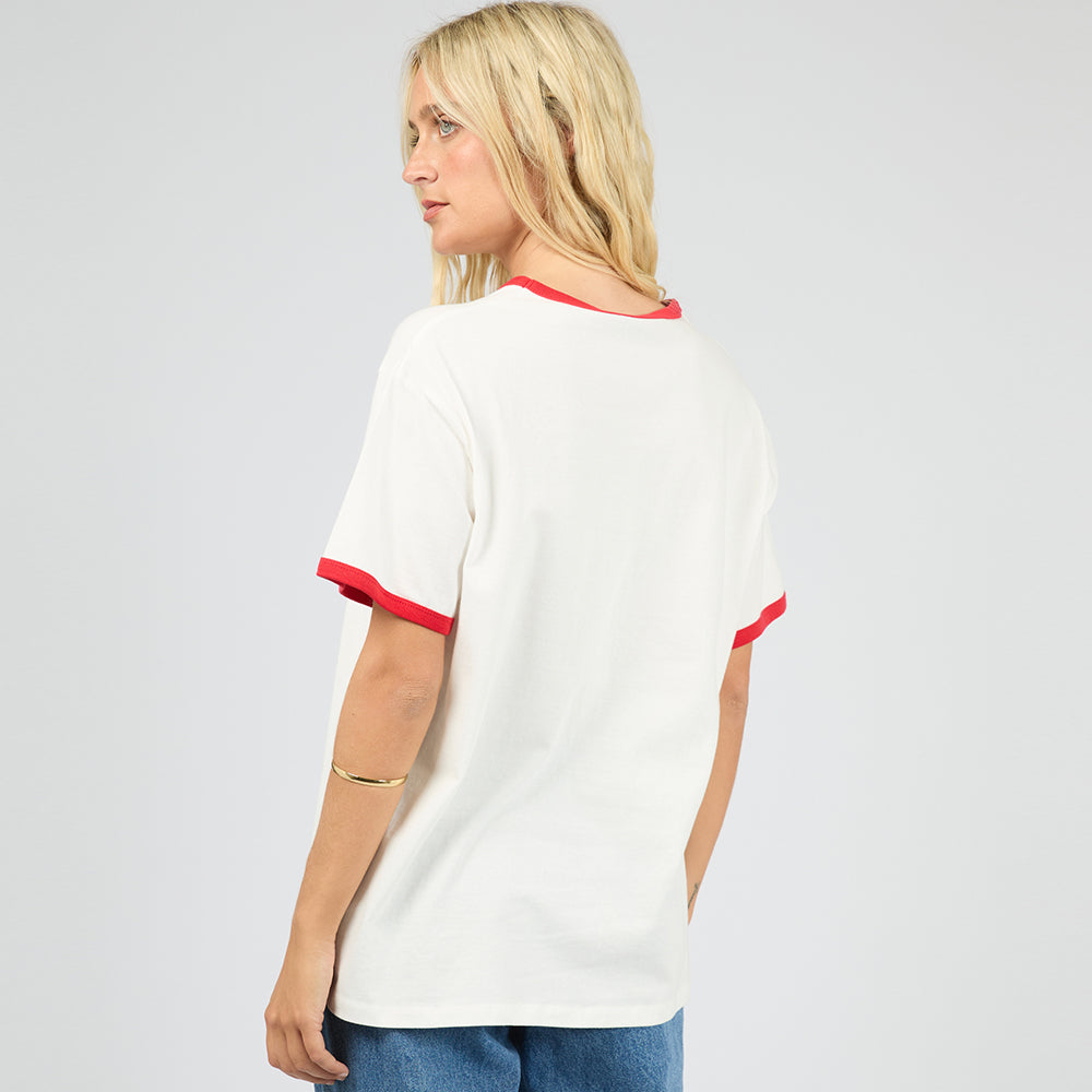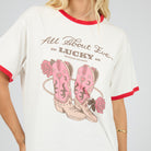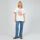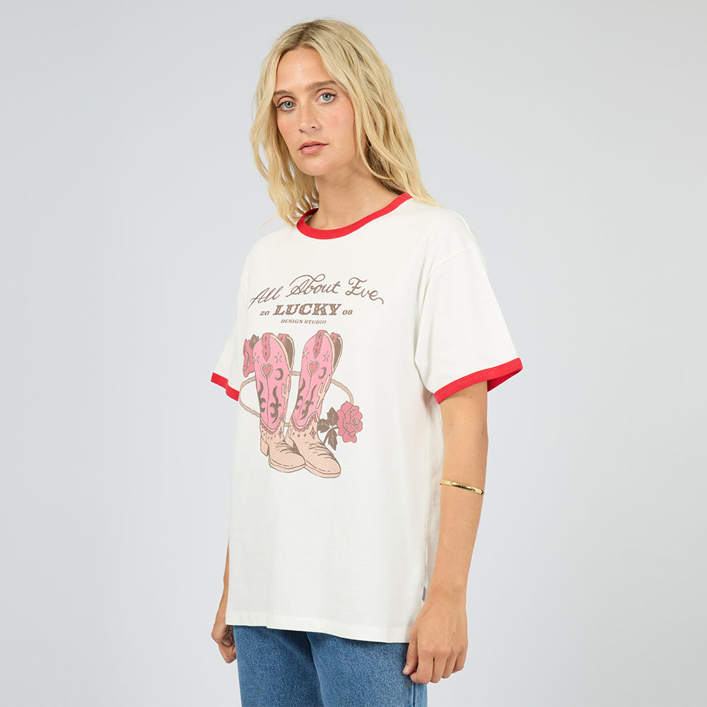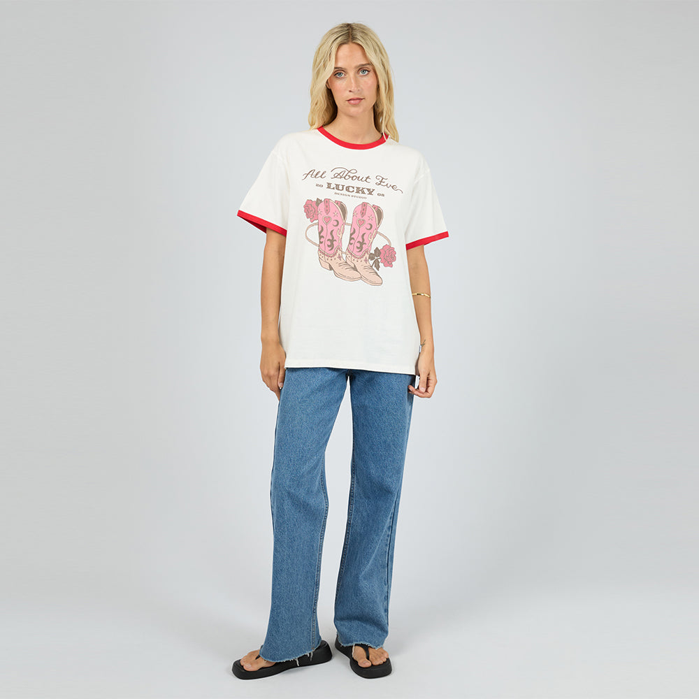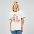 Infused with retro charm, the Lucky Cowboy Relaxed Tee (All About Eve Clothing) in vintage white features a faded cowboy boot graphic with a pop of colour and playful typography. It’s easy silhouette makes it versatile for casual days or festival layering. Pair with denim cut-offs or a maxi skirt for an effortless look that blends vintage Americana with youthful energy.