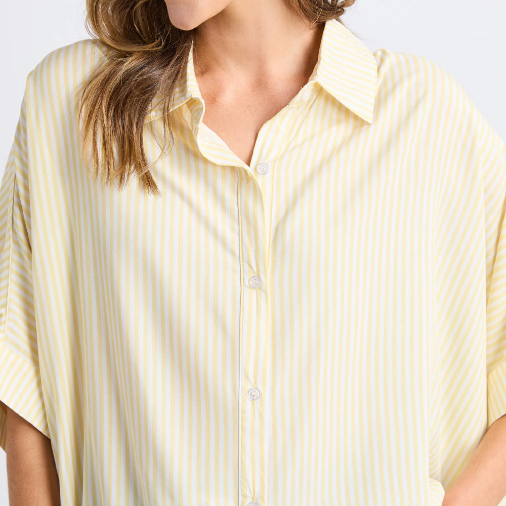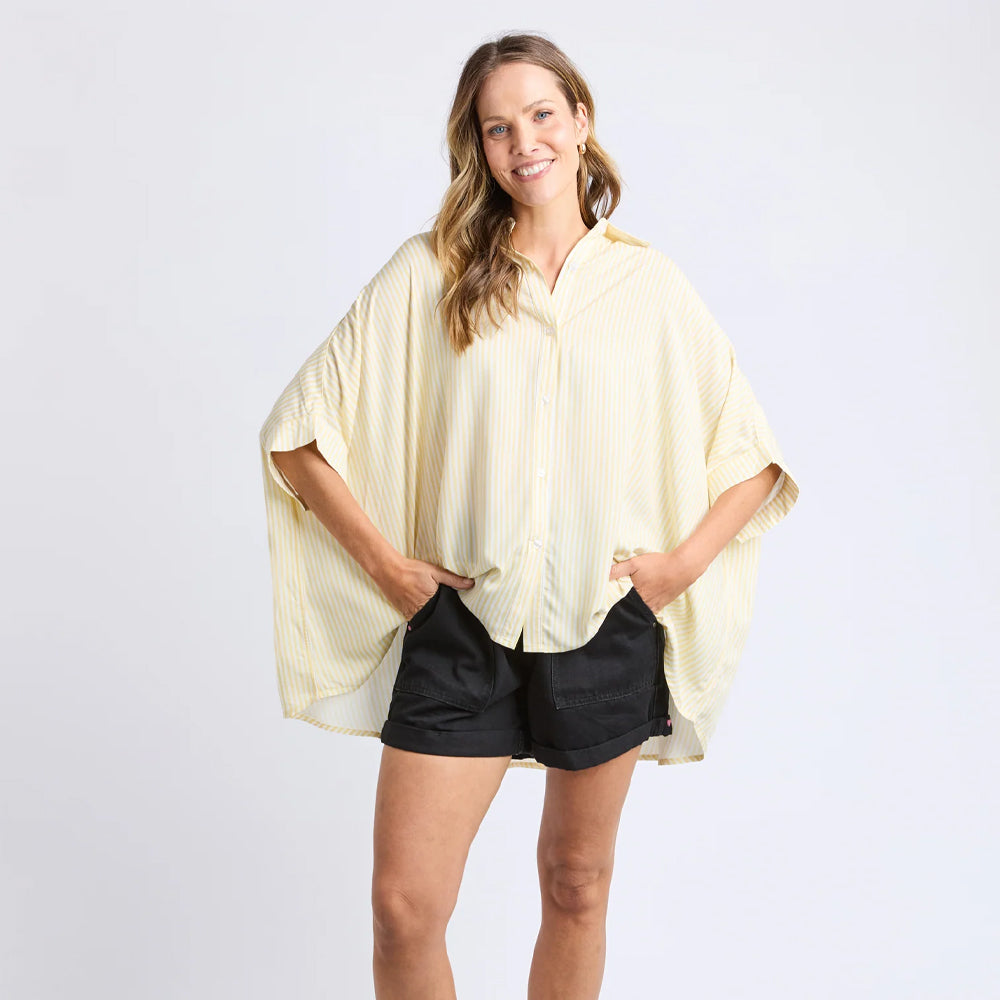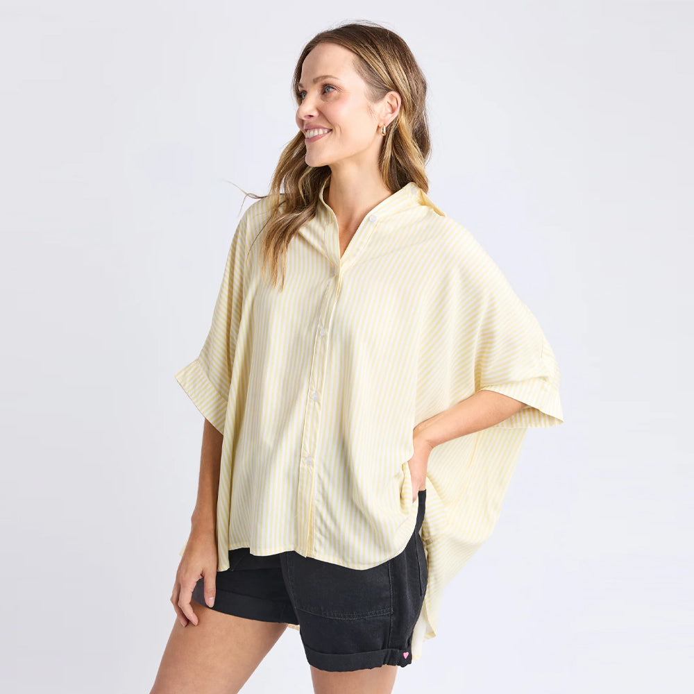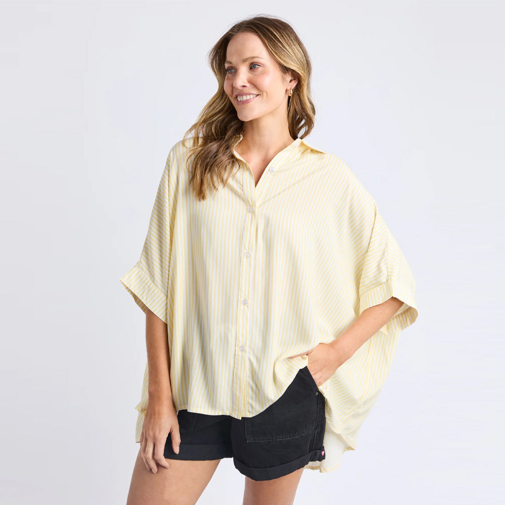 The Luna Shirt (Elm Lifestyle Clothing) is a lovely loose fitting shirt. Featuring a classic button through front in a dusk blue + marshmallow stripe, this is the ideal shirt to wear with your favourite jeans this season.
