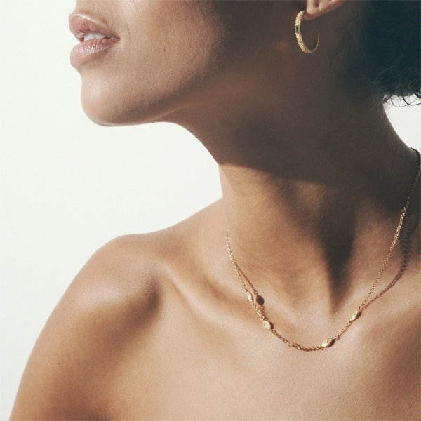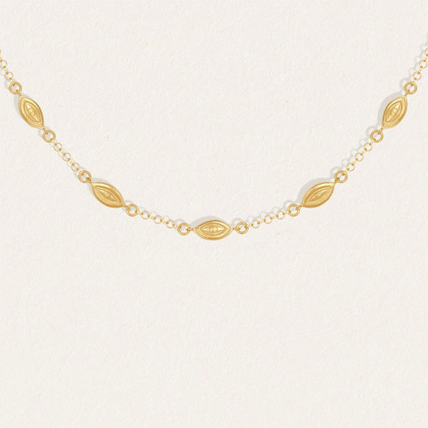 This protective talisman traces a graceful line along the collarbone and can be worn alone for an understated look, or as a textural anchor for a classic Temple stack.