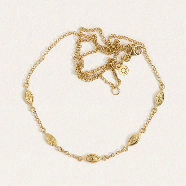 The Mati Station Chain is a series of 18k gold vermeil amulets strung along a polished rollo chain. Each pendant is unique, embossed with the mati motif. Also referred to as an ‘evil eye’, these charms are considered symbols of protection, dating back to antiquity.