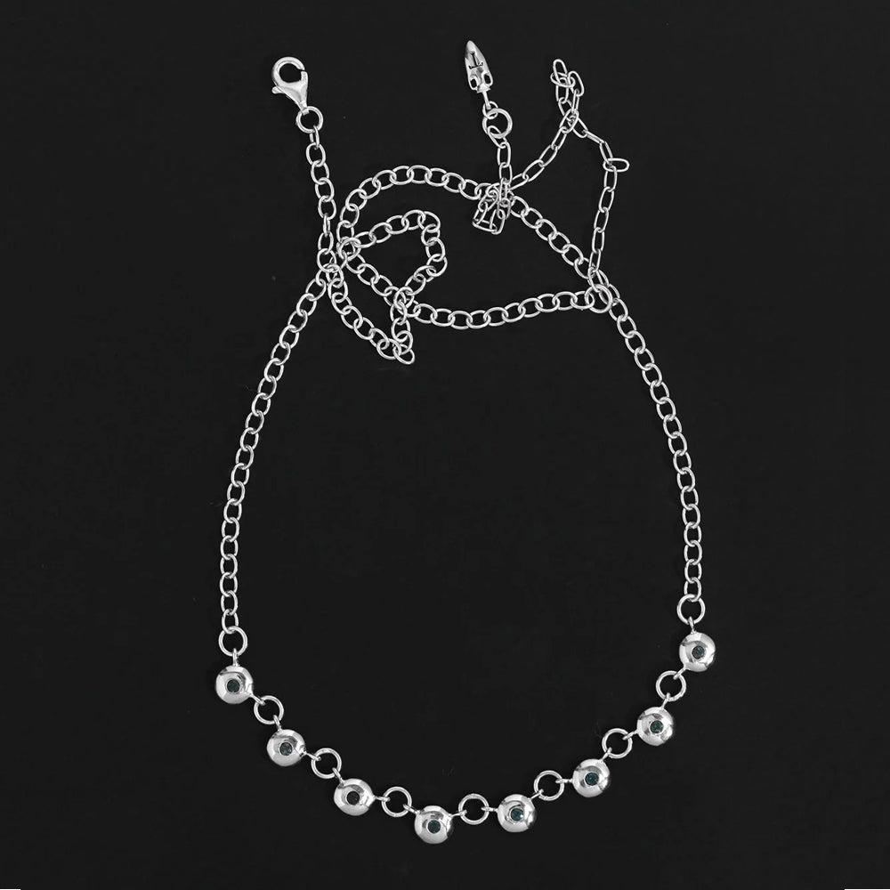 Linked in sequence along a round link chain, each element moves with the wearer, while the teal gemstones embody the bracelet's Turkish name meaning "blue".