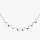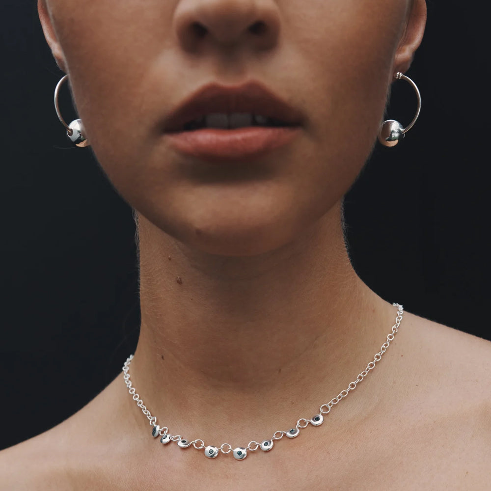 The Mavi Necklace features polished recycled sterling silver lentil discs, each set with blue topaz in a refined interpretation of the protective evil eye.