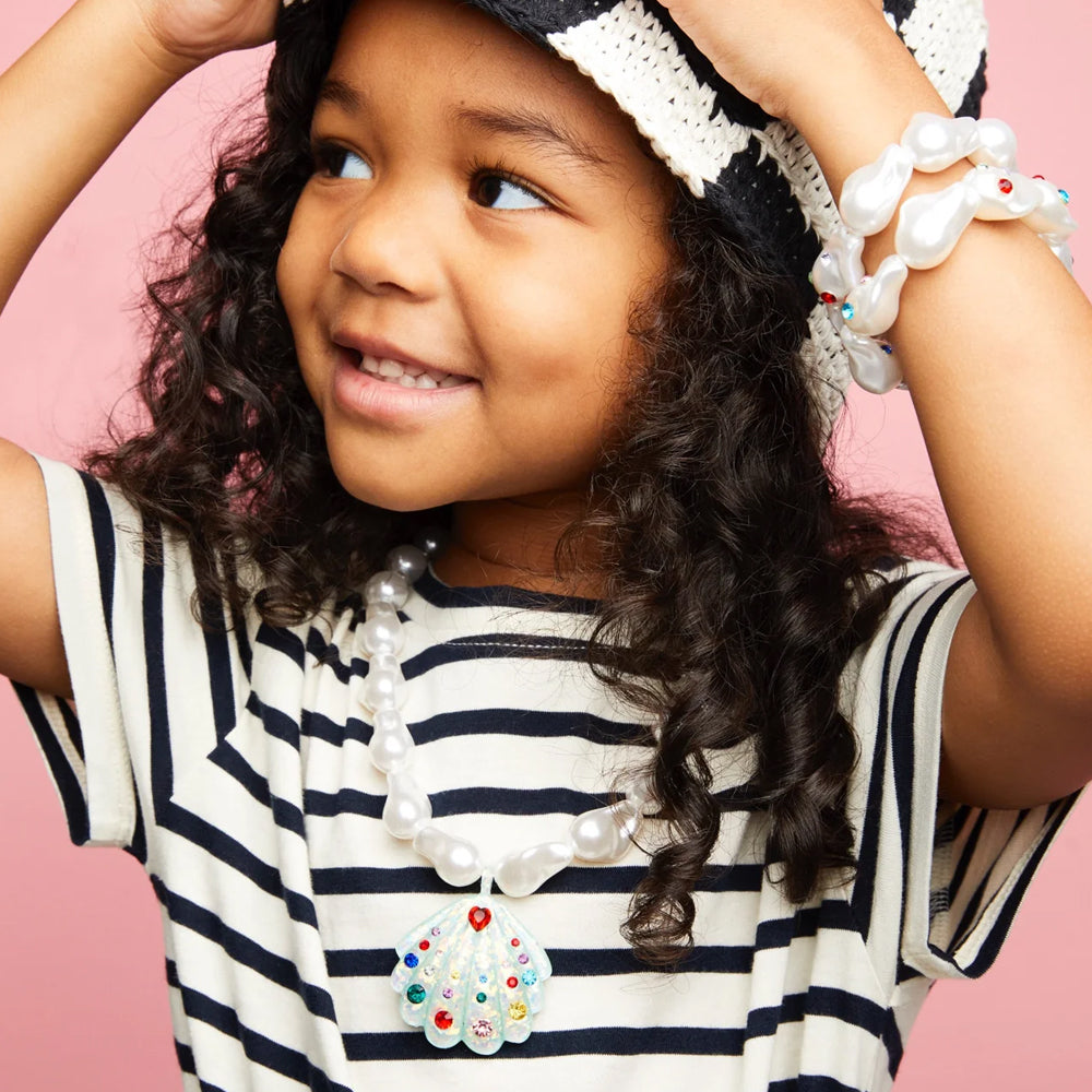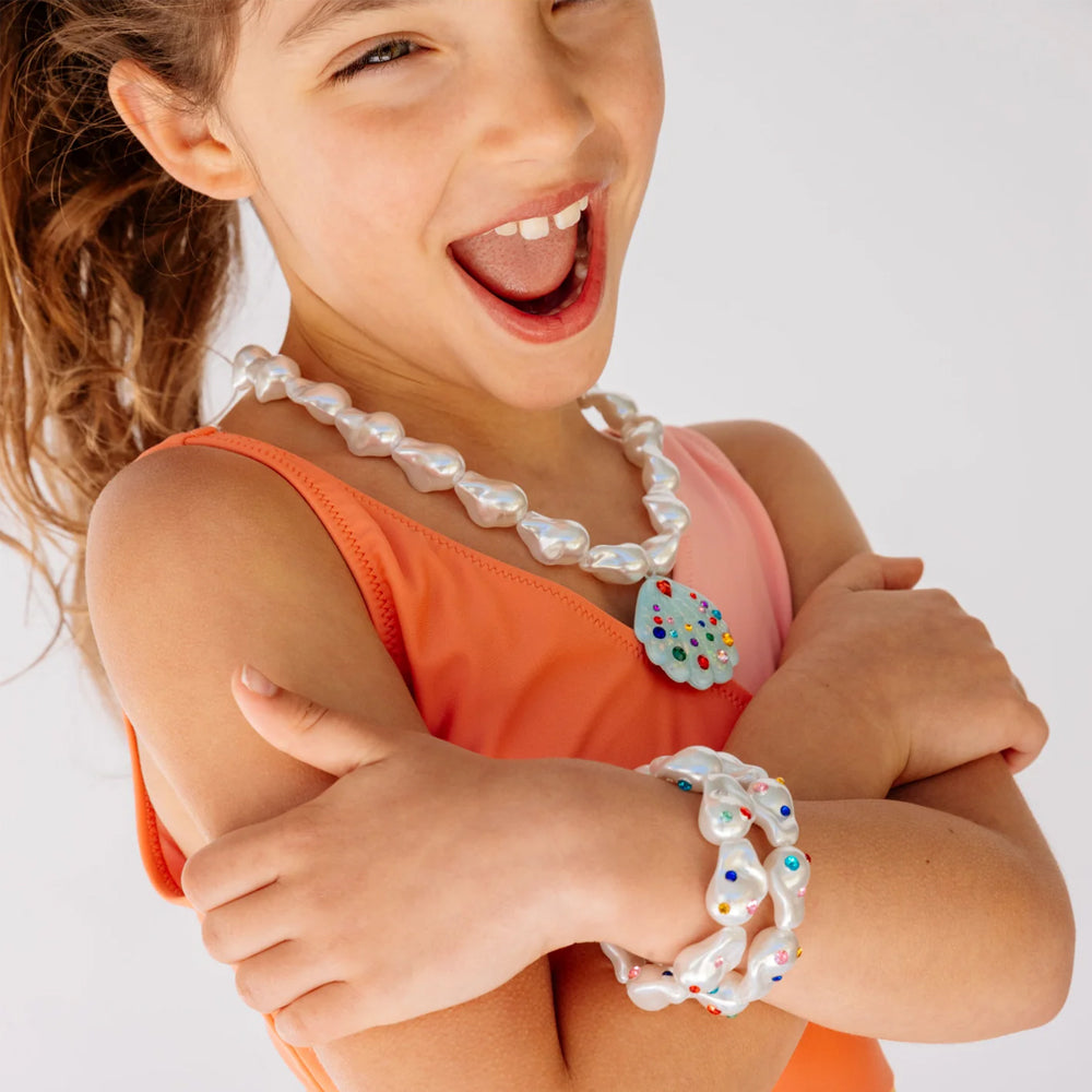 The magical, summery Mermaid Pool Party Mega Set was dreamed up and designed by Luna, Kid-in-Chief at Super Smalls. Featuring “freshwater pearls” and a gem-covered sea shell, these stretchy jewels are made for easy on-and-off and for getting wet. (But keep that goopy sunscreen away from your precious gems!).