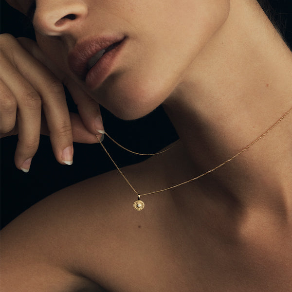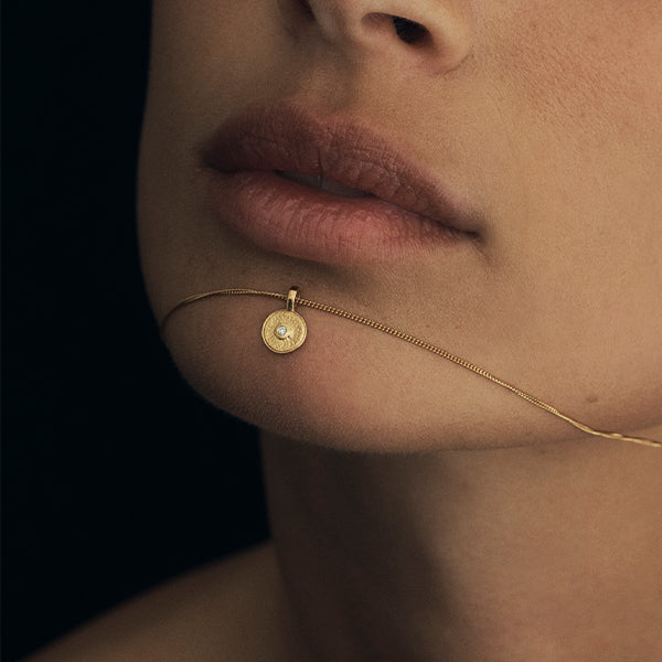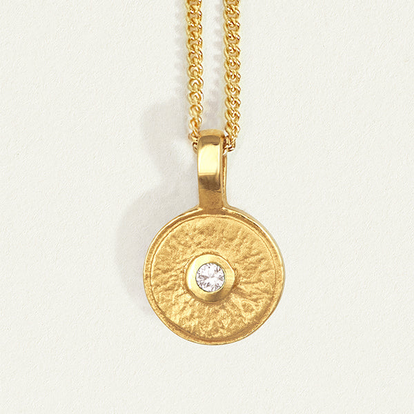 A delicate reimagining of the classic coin pendant, the Mina Necklace features an 8mm pendant cast from 18k gold vermeil. At the heart of the softly textured pendant shines a lab diamond, symbolising eternal love.