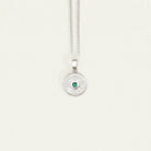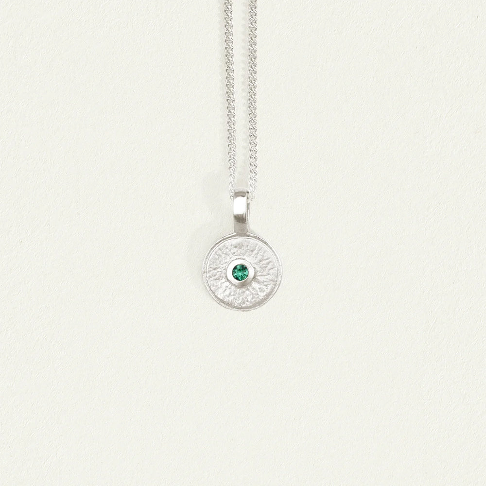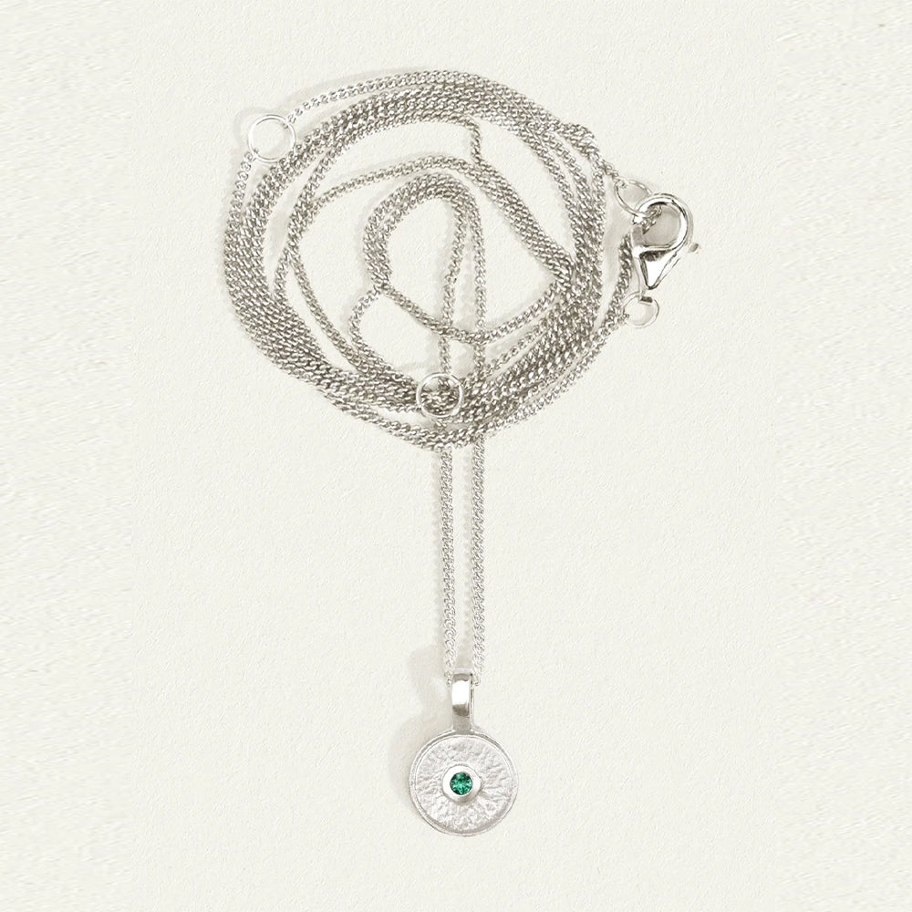 At the heart of the softly textured pendant shines an emerald stone, symbolising new beginnings.