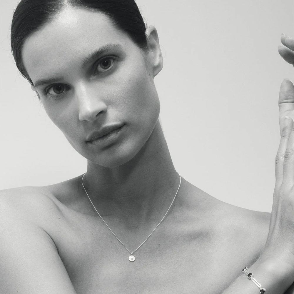 Glow from within, in the Mina Necklace. A delicate reimagining of the classic coin pendant, the Mina Necklace features an 8mm pendant cast from recycled sterling silver.