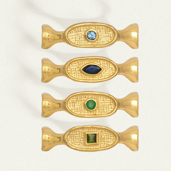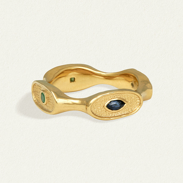Wrapped in the warmth of 18k gold vermeil, the Mira Seal Ring spills with character. Inspired by the gem-encrusted opulence of the Topkapi Palace collection, this four-sided signet ring is set with blue sapphire, emerald, topaz and green tourmaline.