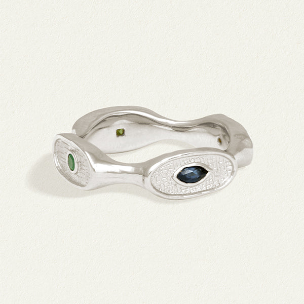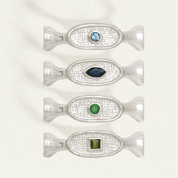 Crafted from recycled sterling silver, the Mira Seal Ring spills with character. Inspired by the gem-encrusted opulence of the Topkapi Palace collection, this four-sided signet ring is set with blue sapphire, emerald, topaz and green tourmaline.