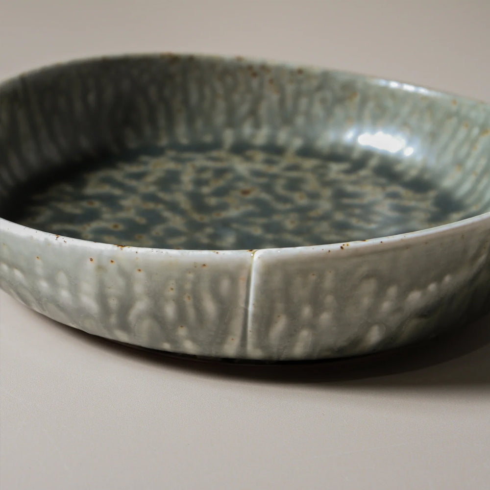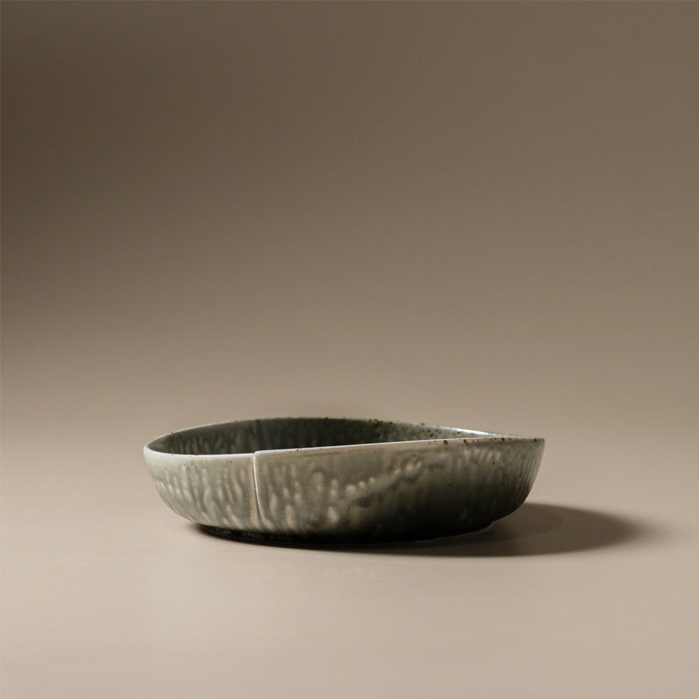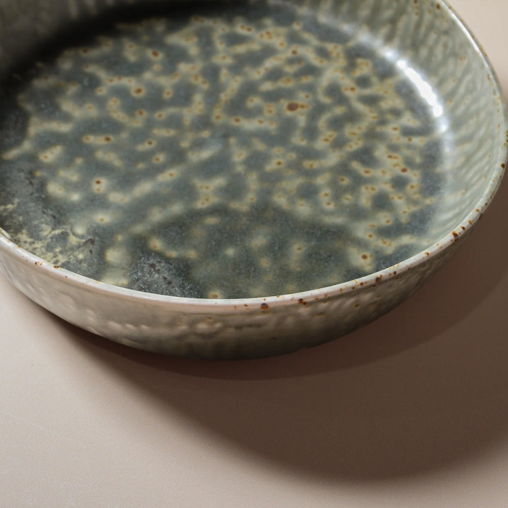 The Mizu Deep Side Plate brings a sense of fluidity and earthiness to your table. Crafted from porcelain with a reactive glaze, its muted green and blue tones blend seamlessly, accentuated by rippled textures and bronze patina.