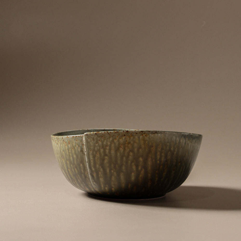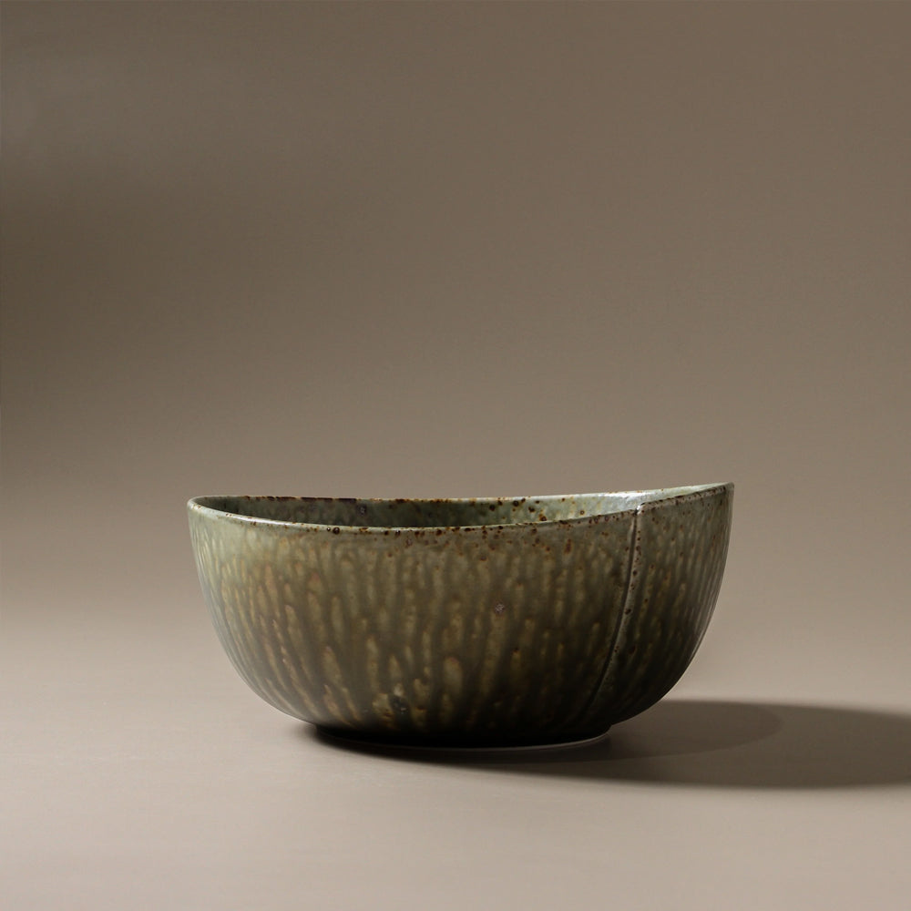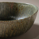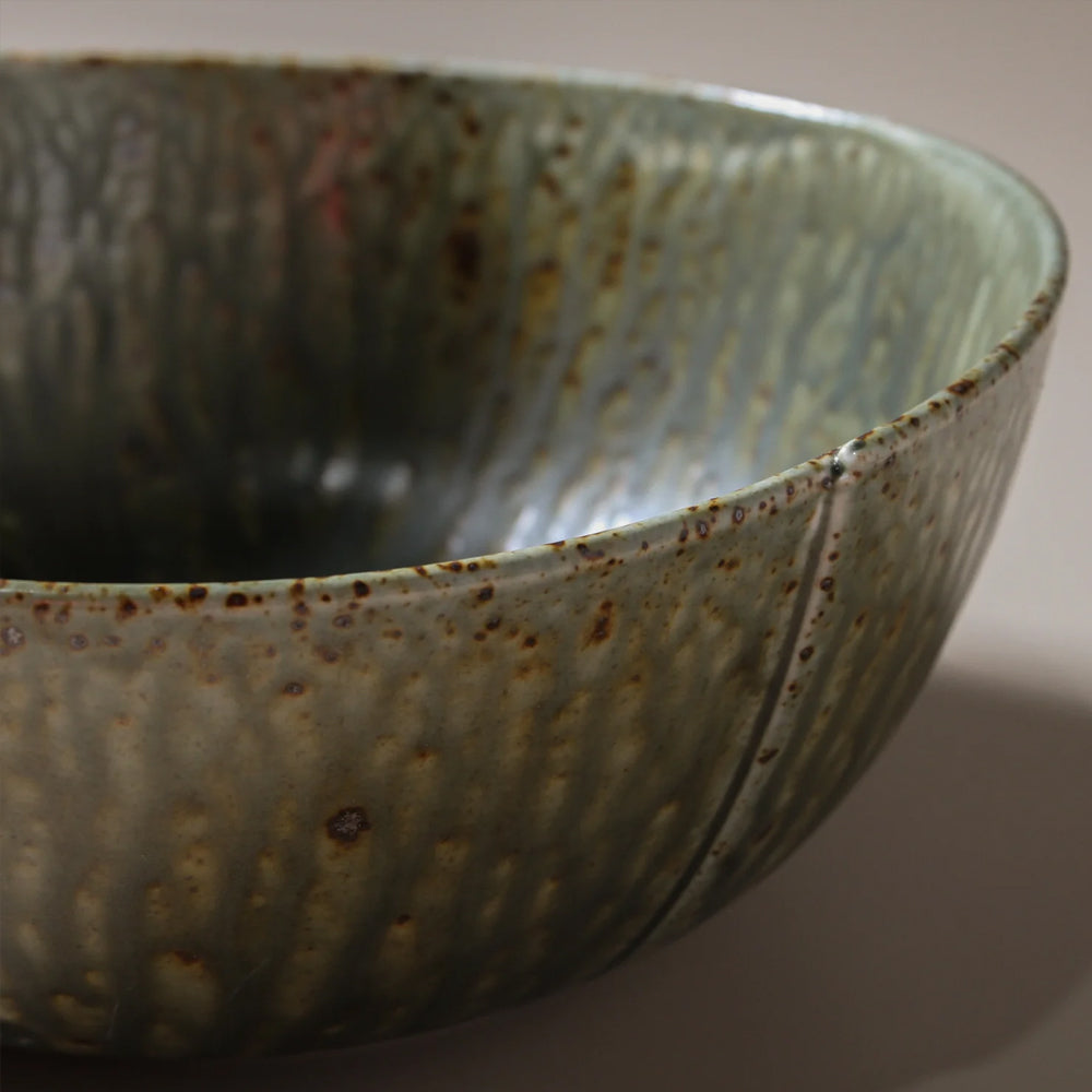 The Mizu Large Bowl offers a sculptural presence with its flowing reactive glaze and earthy palette of greens, blues, and bronze. Its rippled texture and organic form reflect the wabi-sabi philosophy, embracing natural imperfections.