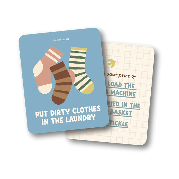 Each card includes an illustration of a task on the front and a choice of three delightful prizes on the back (will I choose a sticker, a piggy-back or extra play time?)