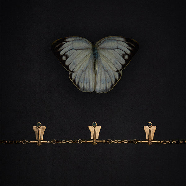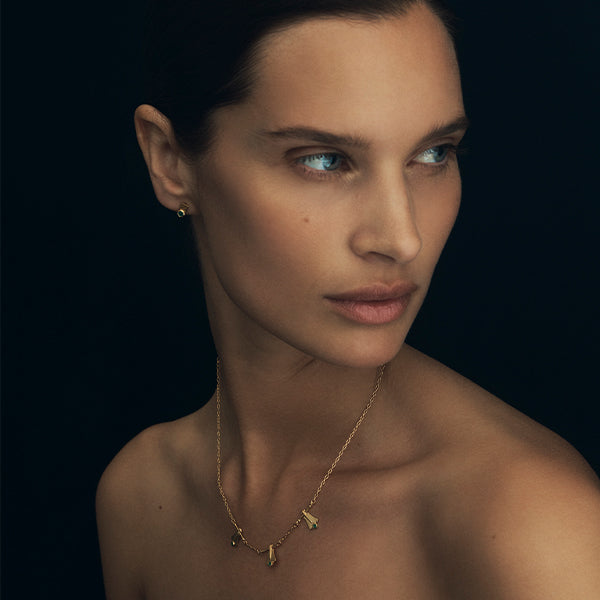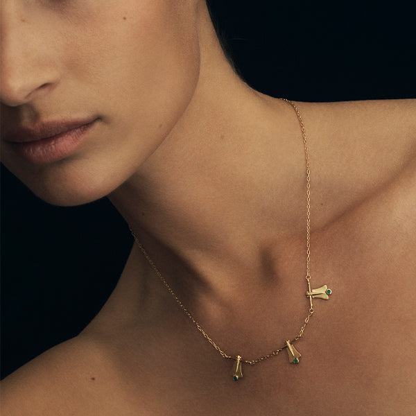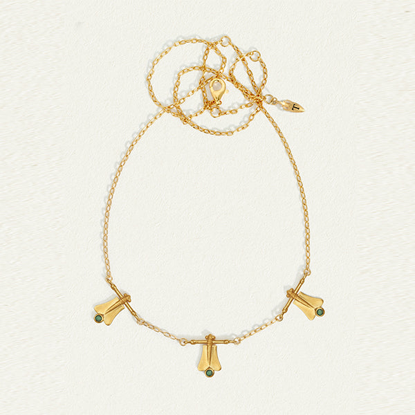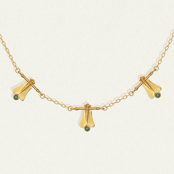 A unique statement necklace crafted from softly brushed 18k gold vermeil. This emerald station necklace features stylised bee pendants, a protective motif sacred to the ancient Mycenean culture.