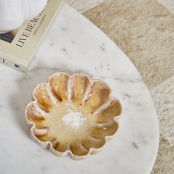 Reminiscent of a treasure you'd find at your Grandma's house, the Odesa Ceramic Bowl is lovey and nostalgic. Featuring scalloped edges and unique markings, this glazed piece makes for special servingware, or a sweet dish to display your favourite jewellery peices.