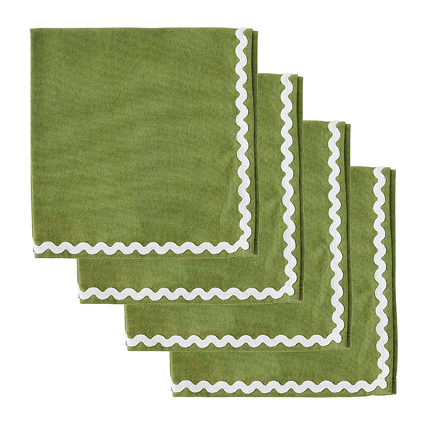 The Orla Cotton Napkins are the finishing touch to our Summer entertaining collection. This simple square olive napkin features a contrasting ivory wavy ribbon detail. The perfect dinner party addition.