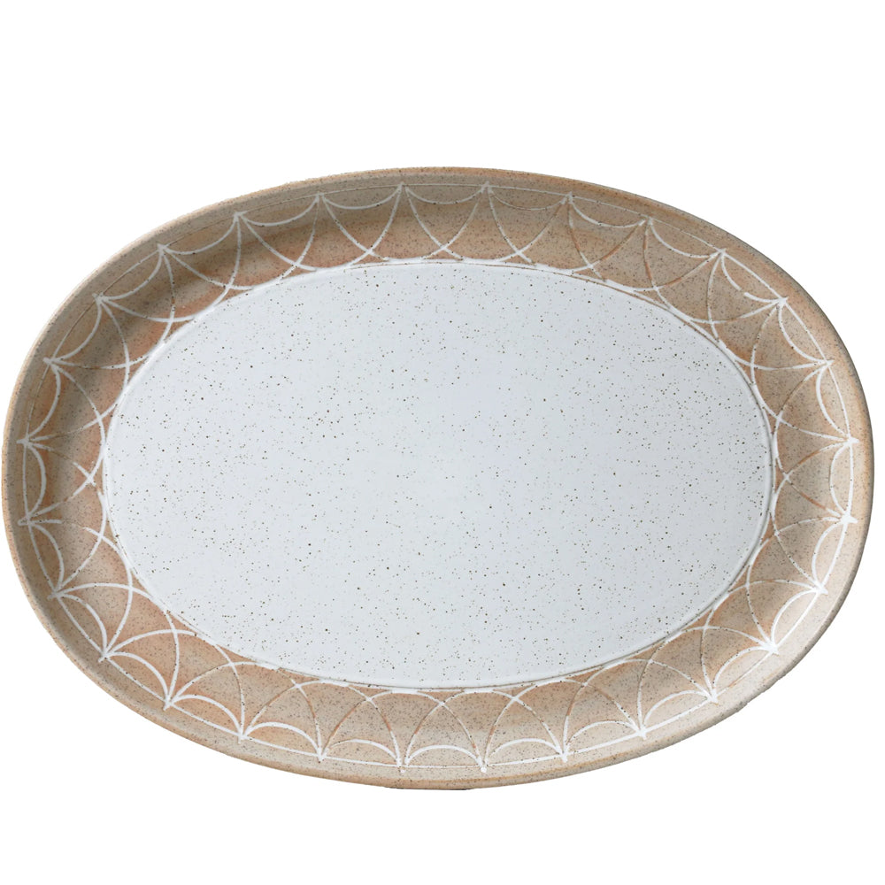 This Oval Platter features an unglazed speckled clay rim with etching detail. It pairs beautifully with other items in Robert Gordon's Natural Entertainer and Garden to Table ranges.