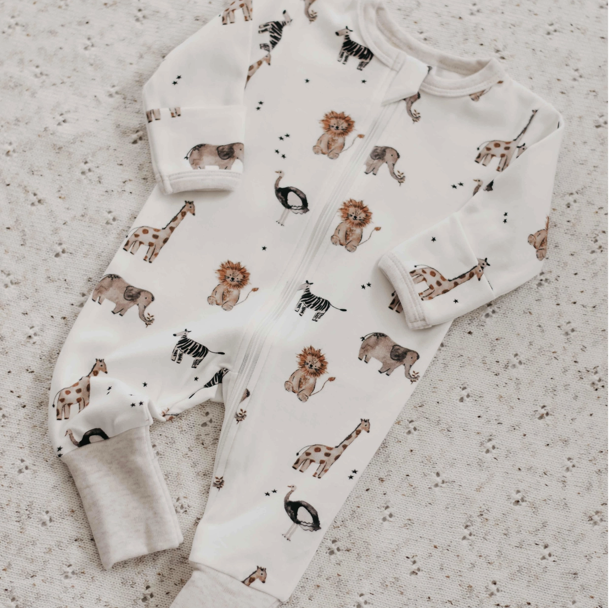 Beautifully illustrated in neutral tones, the Paul Safari ribbed cotton Zipsuit features a full length two-way zip, and both fold over mittens and booties to keep tiny hands and feet free or warm.
