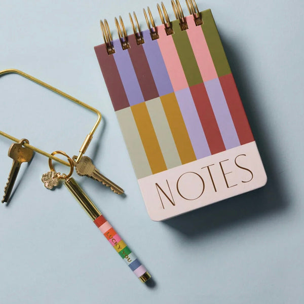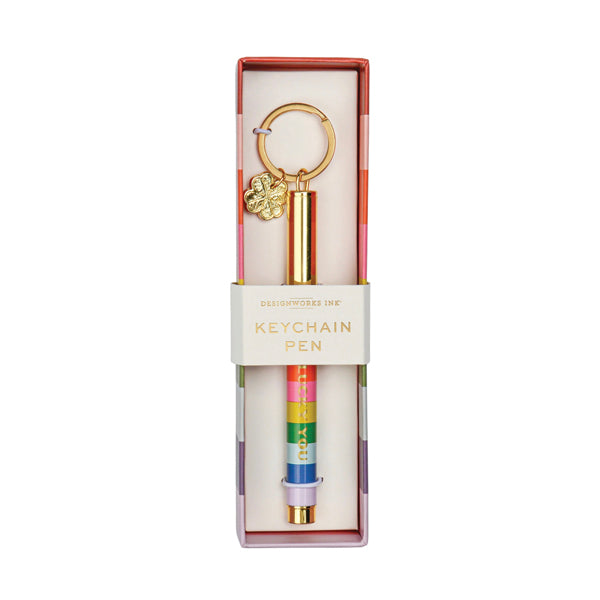 Compact, convenient, and cleverly designed, this miniature marvel ensures you're always ready to write whenever inspiration strikes. Catalog copy: Introducing our new keychain pens! These compact and cleverly designed ink pens are latched onto a gold colored key ring, making them your on-the-go scribe for when inspiration strikes. Each patterned pen design has a gold metallic sentiment and an added gold charm.