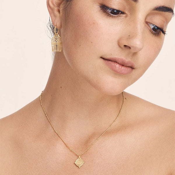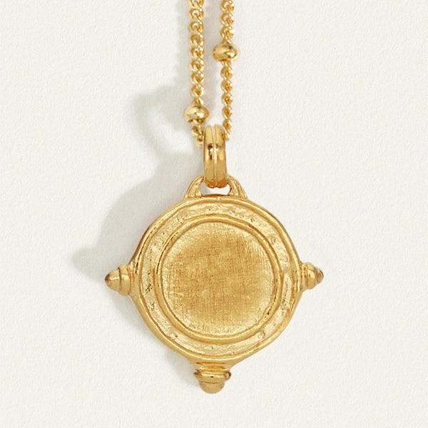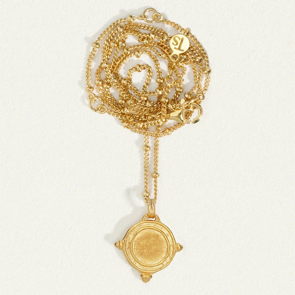 A golden brushed coin held by a fine chain of Gold Vermeil with symmetrical dotted detailing.