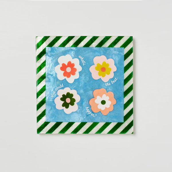 This artisan-made square tile boasts a shimmering capiz shell blue background with four hand-painted, multi-coloured blooms surrounding an inspirational message in stylized script. Framed by a whimsical striped border, it celebrates blossoming positivity through natural materials and uplifting design.