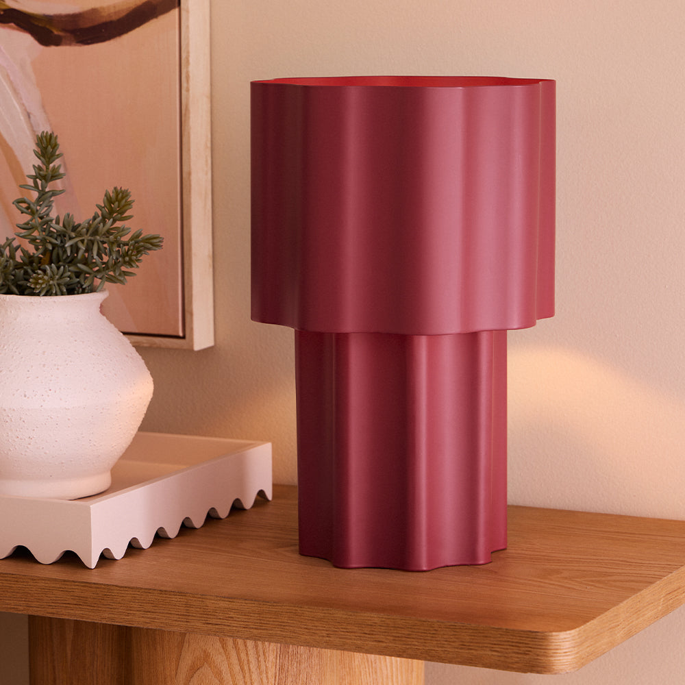 The Ronnie Table Lamp will brighten your day in more ways than one. It features a floral-shaped iron shade with matching base, finished in a rich plum. Its elegant contemporary design is a stylish and practical statement piece in any home.