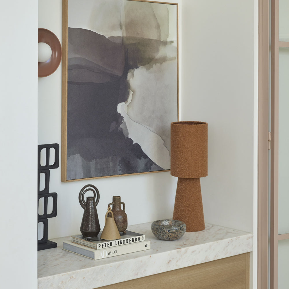 All about texture, the Rowen Table Lamp is made with tactile boucle fabric for a soft hand feel, bringing a cosy mood to every space. This burnt orange lamp features a colour-matched woven power cord with black switch, and a tall, slim silhouette.