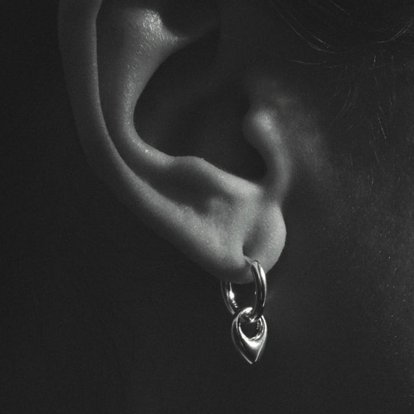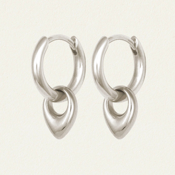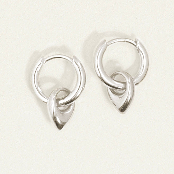 The Sanna Earrings are polished, recycled sterling silver huggies inspired by lotus petals. Symbolising purity and resilience, sculptural drops entwine with ethereal hoops in a transformative dance of renewal.