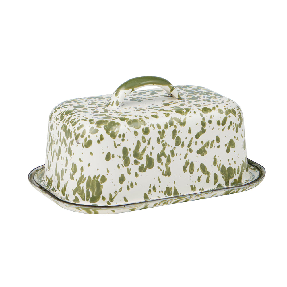 Featuring a handle and speckled olive finish, this durable dish keeps butter covered and accessible.